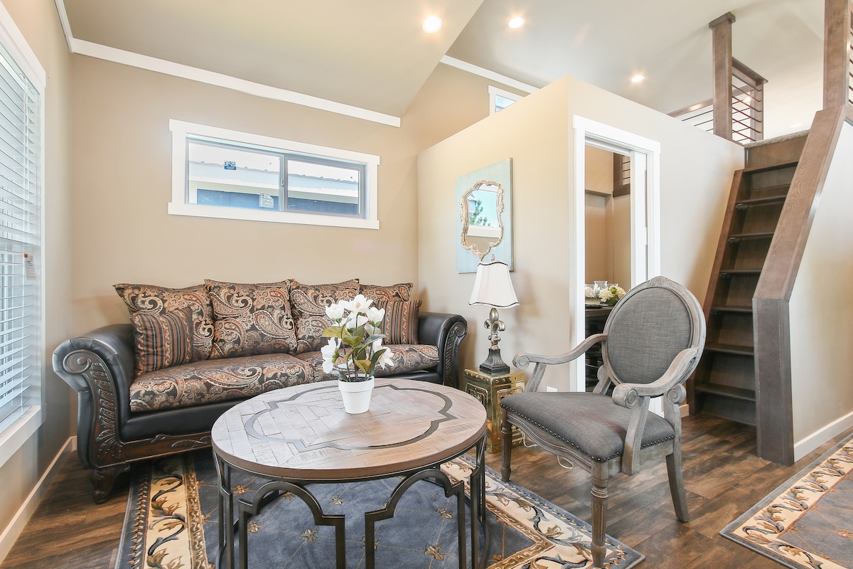The simplicity & relaxation of our premium 399 Sq. Ft. tiny home is so refreshing and unique. This home sleeps four. It has a Queen size bed and a luxury pullout Queen sofa. The fully equipped kitchen is perfect to fix up your gourmet meals. The Bluebonnet is nestled beside our glistening 1/2 acre pond with ducks, fish and a fountain. A wooded area behind and open fields out front brings a nice breeze across the porch. Makes for a perfect place to enjoy the sunset & stars!