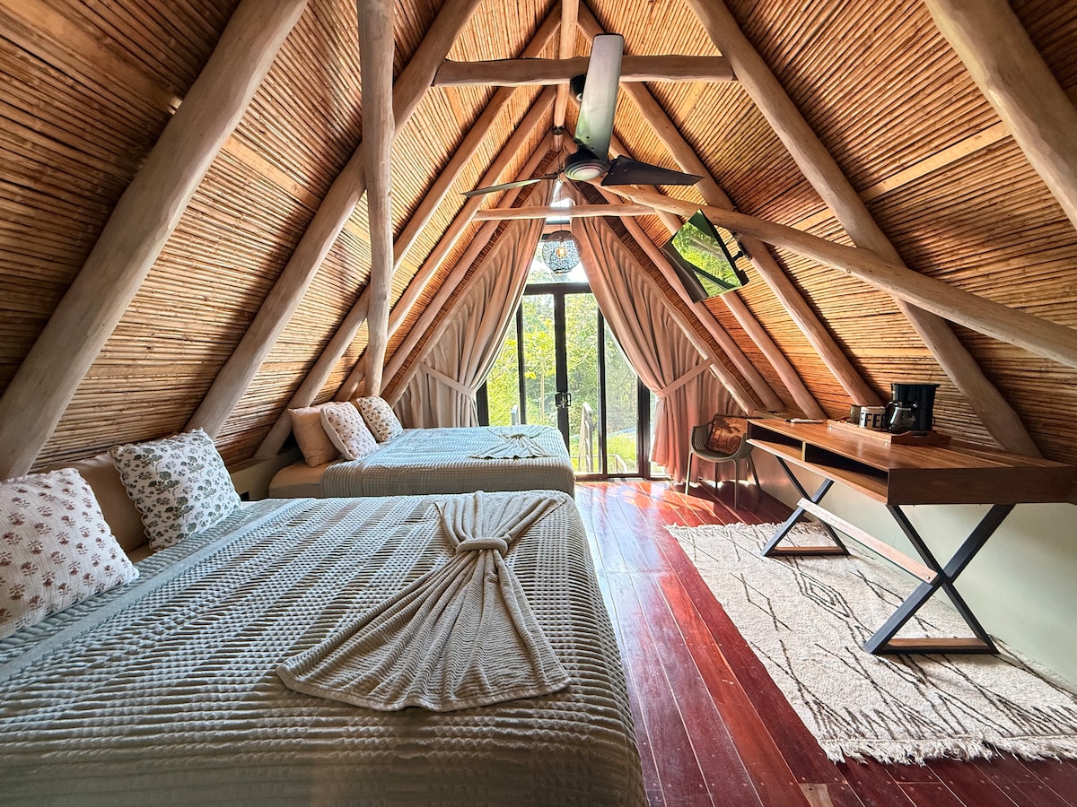 Casita de la Luna and its fraternal twin, Casita del Sol make up the first floor of a newly-built house on the ocean, at the mouth of Rio Nosara. Peaceful, quiet, a bit away from Guiones and Pelada, but close enough you can walk, drive or grab a tuktuk. Enjoy your own entrance and a beautiful shared beach-front salt-water pool overlooking the wilderness. Disconnect from the world in this perfect spot, where you can swim, explore tide pools, SUP on the river, or surf empty waves just steps away.