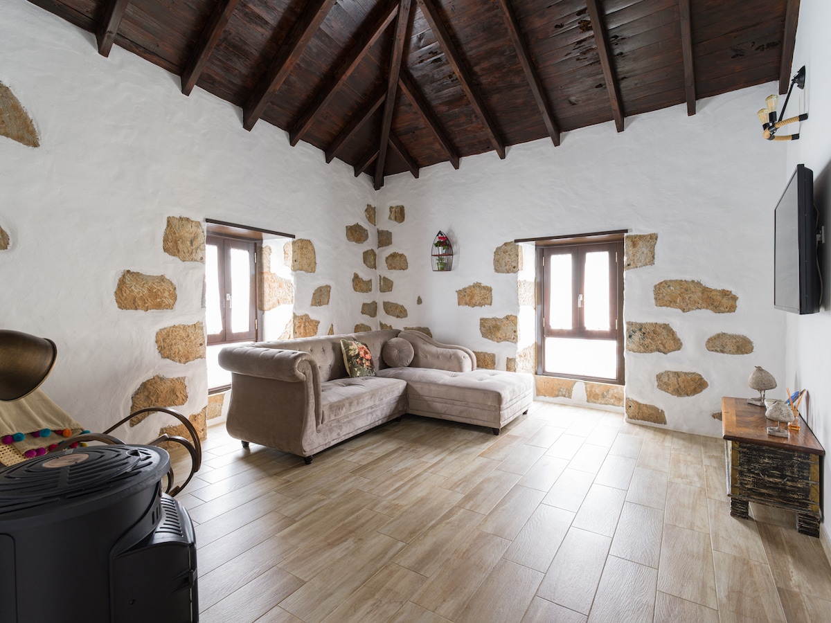 Casa típica y tradicional canaria restaurada de más de 100 años de antigüedad, con muros de piedra y techos de madera y chimenea, sin otras casas alrededor, en paisaje agrícola a cuarenta minutos de Las Palmas de Gran Canaria y veinte de la costa. La tarifa señalada es para dos personas adultas más niños menores de 18 años. se sumará diez euros día por cada adulto adicional a los iniciales que quieran