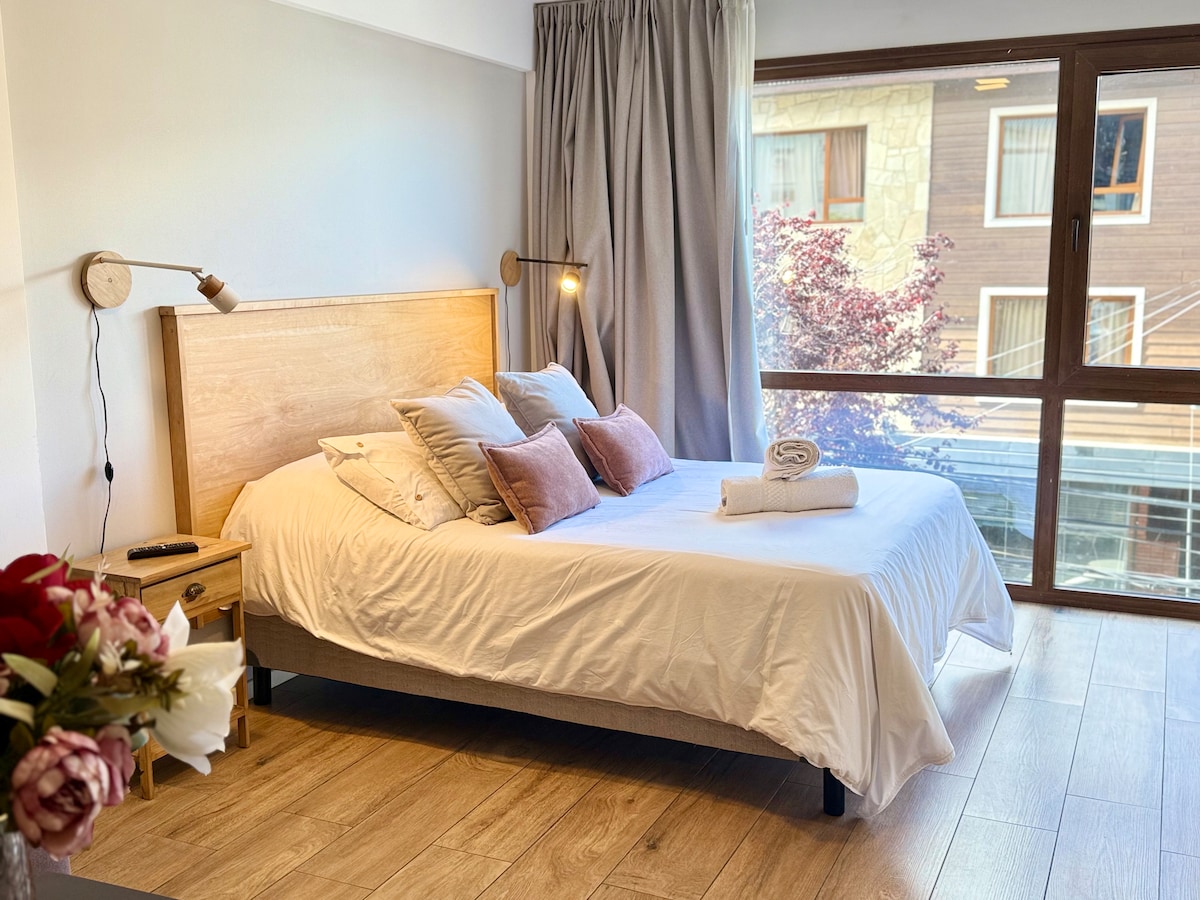 Departamento de 2 ambientes con excelente ubicación, a 3 cuadras del centro cívico, rodeado de restaurantes y a metros de la zona cervecera céntrica. Cuenta con 1 habitación con cama matrimonial, en el living se arman 2 camas individuales. Desde los ambientes se abre la vista a una terraza propia, amplia. Decoración moderna y cómoda pensada para que su estacia en Bariloche sea como en su casa. Wifi y tele con Chrome cast. No se admiten grupo de jóvenes ni mascotas. Opcional cochera fija x día.