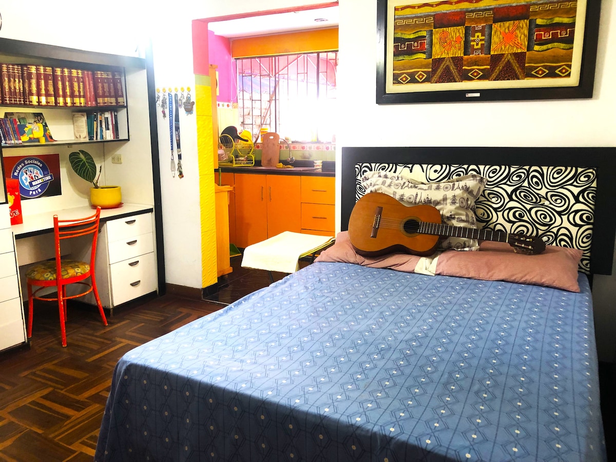 Disfruta de la sencillez de este alojamiento tranquilo y céntrico,2do.piso independiente con puerta y ventana a la calle, salita comedor, dormitorio con cama de 2 plazas, guardarropa, tv con internet, baño privado con agua caliente, toallas, papel higiénico, jabón, acceso a la cocina solo para estancias mayores a 7 días, equipada con refrigeradora ,microondas, licuadora y vajilla, en plena ciudad, cerca a la universidad La Católica y San Marcos, centro comercial, farmacia, súper mercados, etc