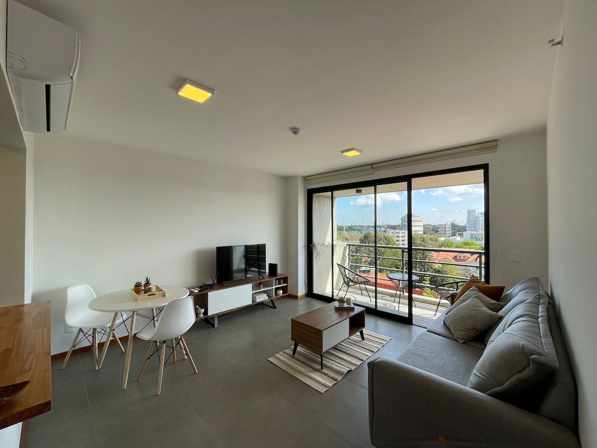 Departamento ubicado en un piso alto, con balcón y vista despejada, totalmente equipado para una estadía cómoda: - Cama king con colchón firme de alta densidad - Espacio de trabajo con escritorio y conexión WiFi - Smart TV de 55'' - Rooftop con piscina y gimnasio - Quincho - Lavandería - Seguridad las 24 horas Ubicación excepcional: - Situado en el Eje Corporativo, a solo 5 minutos del Shopping del Sol y Paseo La Galería - A 15 minutos del Aeropuerto Internacional Silvio Pettirossi