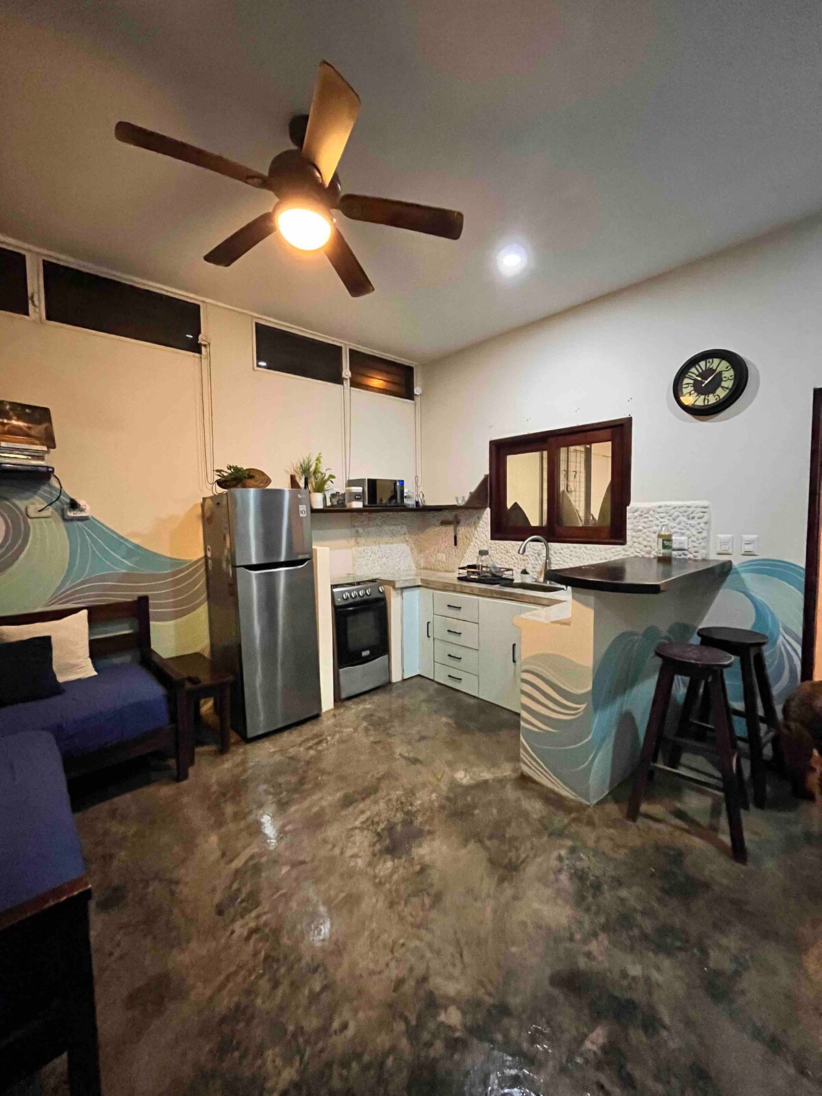 Acogedor estudio moderno para 2, a solo 50 m de la playa y a pocos pasos del Malecón. • Cama tamaño queen con sábanas limpias • Aire acondicionado y wifi rápido • Televisión inteligente para streaming • Cocina americana con nevera, fogones, cafetera, licuadora • Balcón compartido con vistas al mar y al atardecer • Ventanas que dan a la calle • Baño completo con ducha caliente Base perfecta para explorar San Juan del Sur a pie. Disfruta de un fácil acceso a todo desde esta base de operaciones perfectamente ubicada.