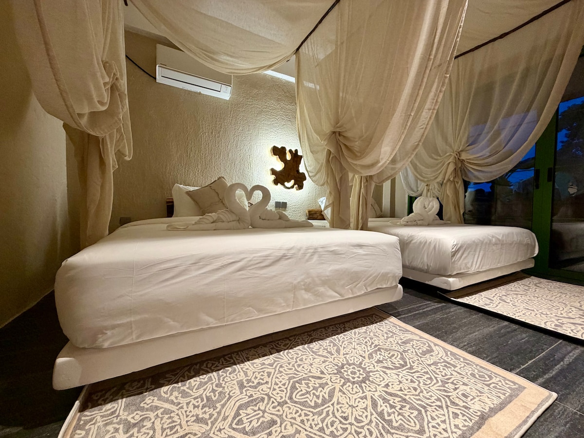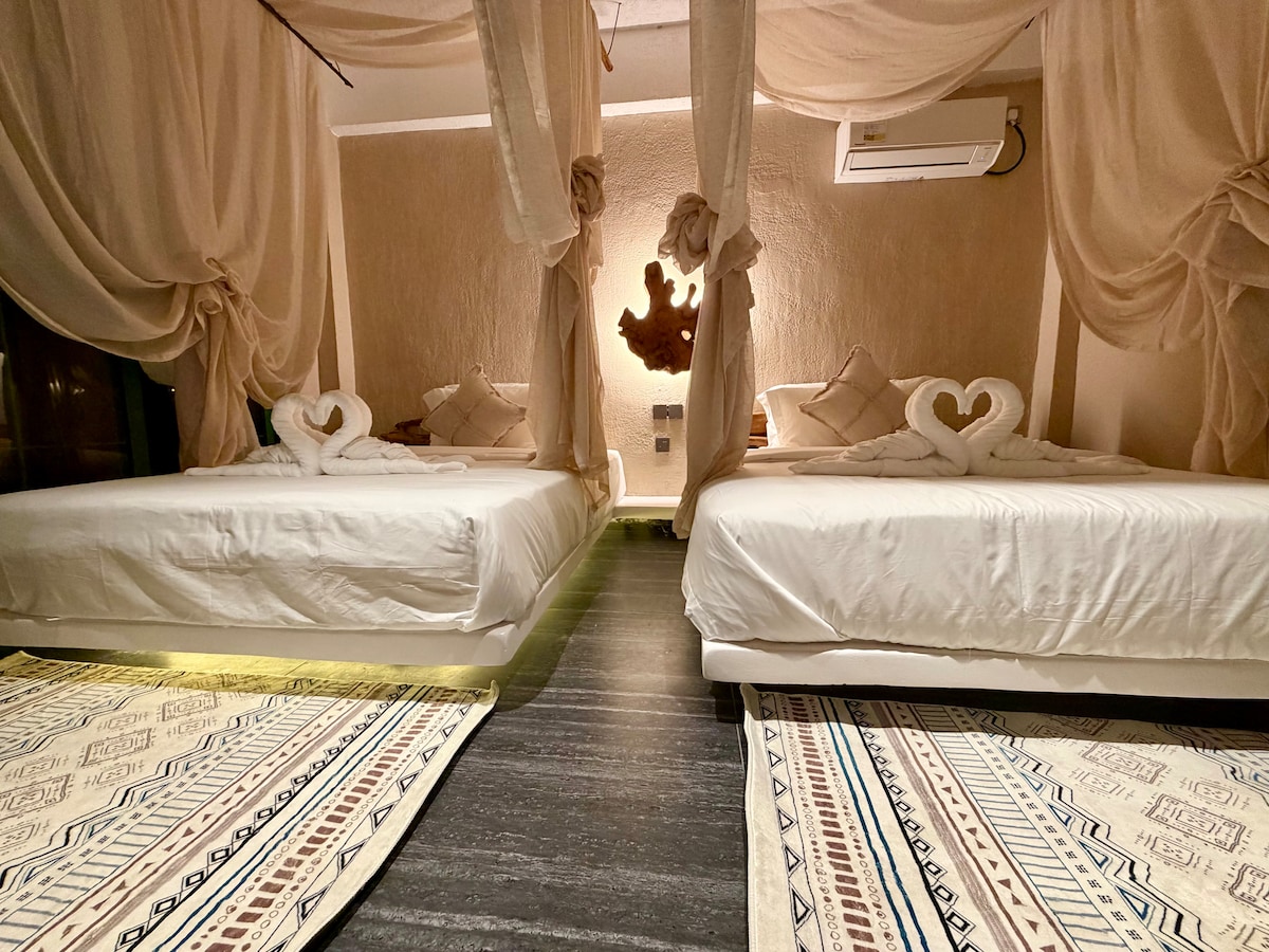 Habitación familiar doble, frente al mar y playa. 2 habitaciones y 2 Cr. 2 camas dobles y 2 camas individuales + 2 colchones adicionales. con aire acondicionado. Comparte la cocina pequeña para cocinar. En la ciudad turística de San Juan, cerca de mercados, restaurantes, tiendas, cajeros automáticos y JJ's Night-Life Beach Club. Este elegante lugar está cerca de todo y es fácil de recoger para excursiones de un día y destinos turísticos. El restaurante con vista al mar en la planta baja, abierto para el desayuno cierra a las 10:30 p. m. todos los días. Alquiler de motos cerca.