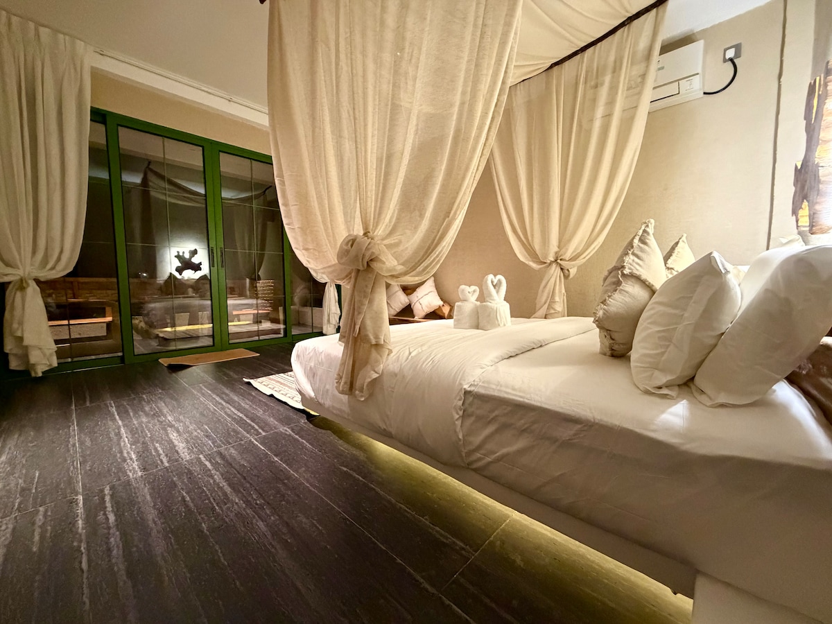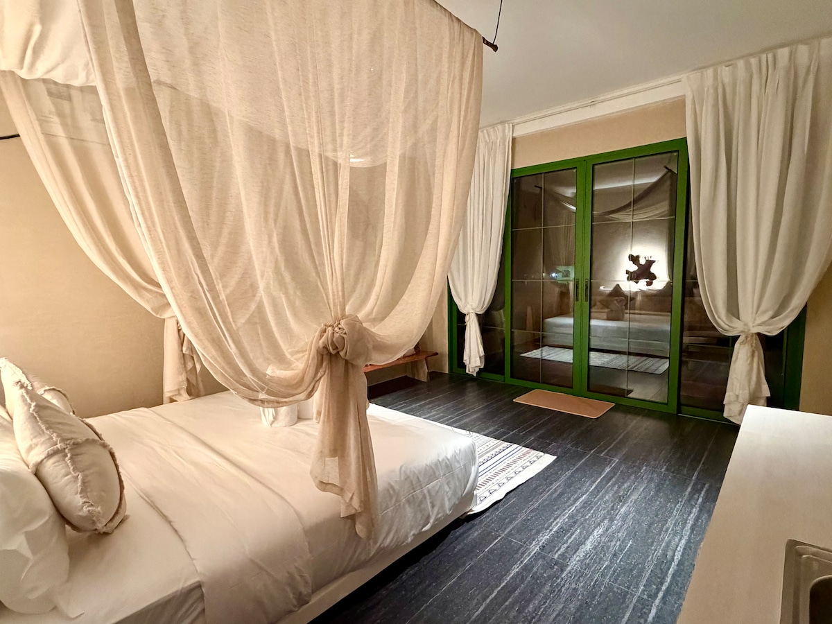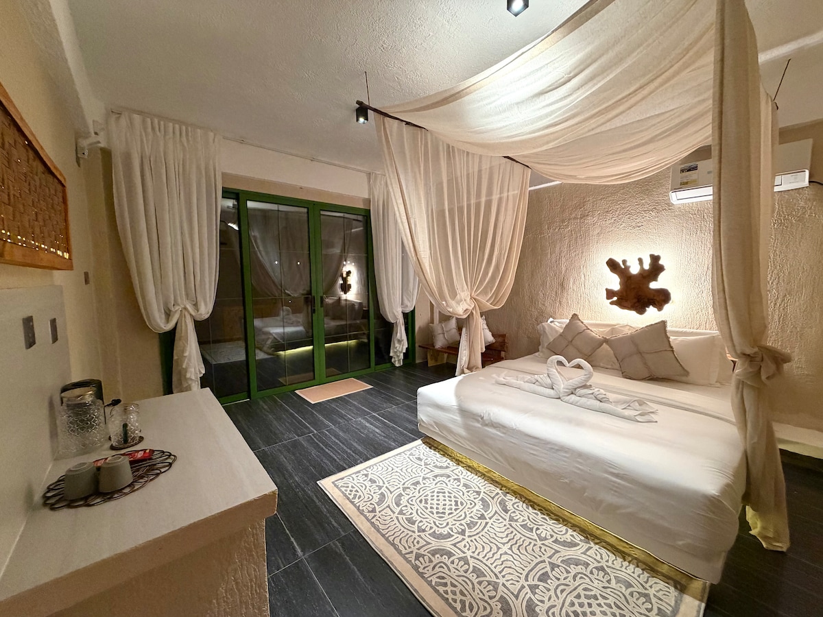 We are not on the beach or the main road. Paliton Beach is about 5 minutes away, and Siquijor Port is around 15 minutes by scooter or car, and parking is available. A bright second-floor room with a beautiful combined view of the tropical garden and the natural swimming pool. Features a 1.8 × 2.0m King bed. Guests enjoy Starlink Wi-Fi, reliable solar-powered electricity, and access to our naturally filtered 90㎡ swimming pool.