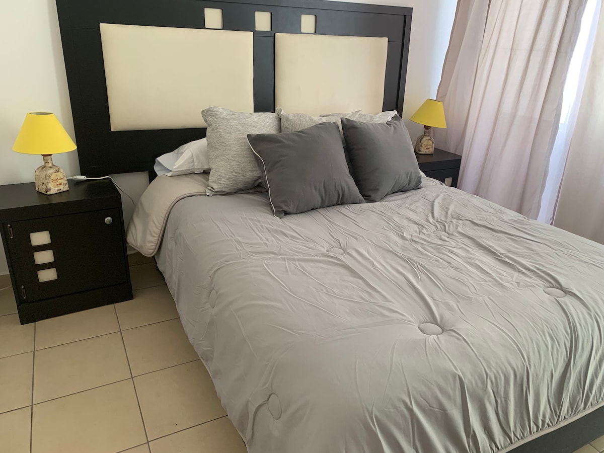 Elegante y moderno, ideal para familias, PERSONAL DE EMPRESAS, docs o turísticos, FACTURAMOS (preguntar), bien equipado, con 2 habitaciones (6 camas y 2 sofacama) ideal para estancias largas o cortas, con estacionamiento dentro del edificio, que goza de privilegiada ubicación residencial, tranquila y segura, minimo ruido externo, a poca distancia de comercios, parques, zonas deportivas, lavandería, tomas de autobús y bares, a 7 min del centro de la ciudad, CUaltos, hospital regional y del IMSS,