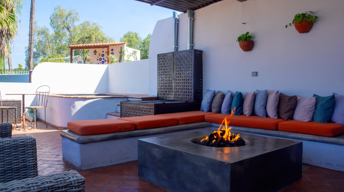 Why stay in a hotel with a fabulous rooftop when you could have your own? Contemporary and comfortable space in the heart of San Miguel de Allende, with rooftop views, gas barbecue space, rooftop pool, and firepit. Soaking bathtub in main bathroom. Flat walk to the central square (Parroquia and Jardin), Mercado San Juan Dios, Mercado Ignacio Ramirez, Bellas Artes, and Angela Peralta Theater in less than 10 minutes. Minutes to a grocery story and bakery. Laundry room, TV room. NO PARTIES ALLOWED