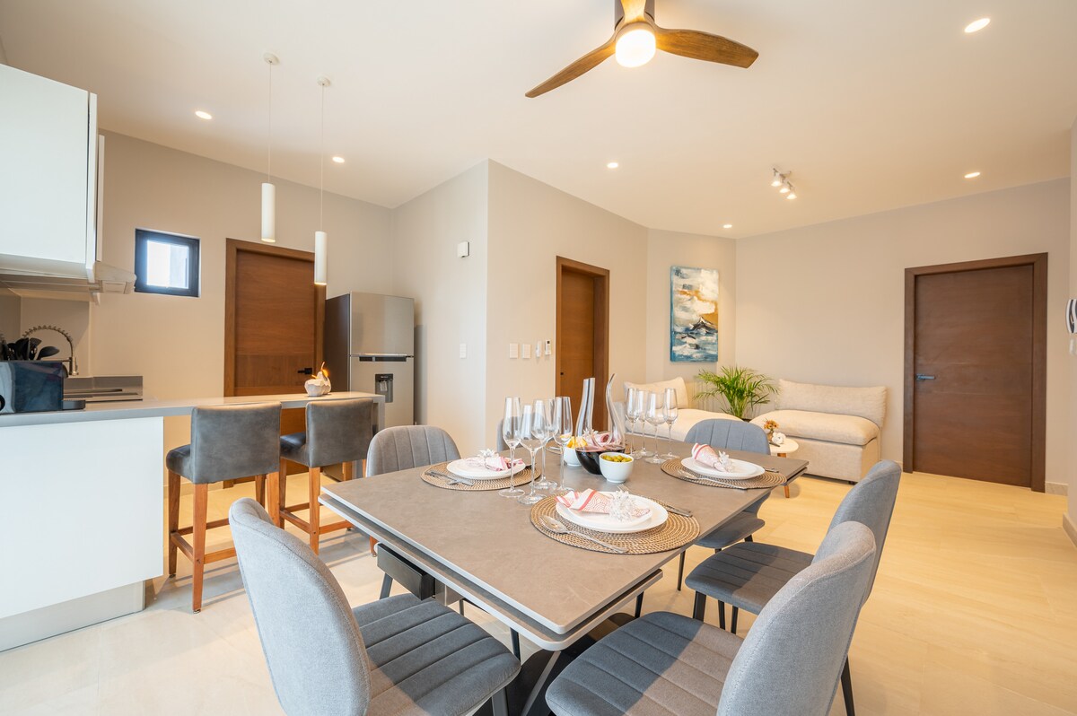 Bienvenido a nuestro impresionante apartamento de lujo de 2 habitaciones, ubicado en el corazón de Cozumel. Con dos hermosas terrazas, este apartamento le brinda el lugar perfecto para disfrutar de la tranquilidad de la isla. Tan pronto como cruce la puerta, será recibido por una amplia y moderna sala de estar, decorada con muebles elegantes y una abundancia de luz natural. La sala de estar está equipada con un gran televisor de pantalla plana, y un área de comedor para cuatro personas.