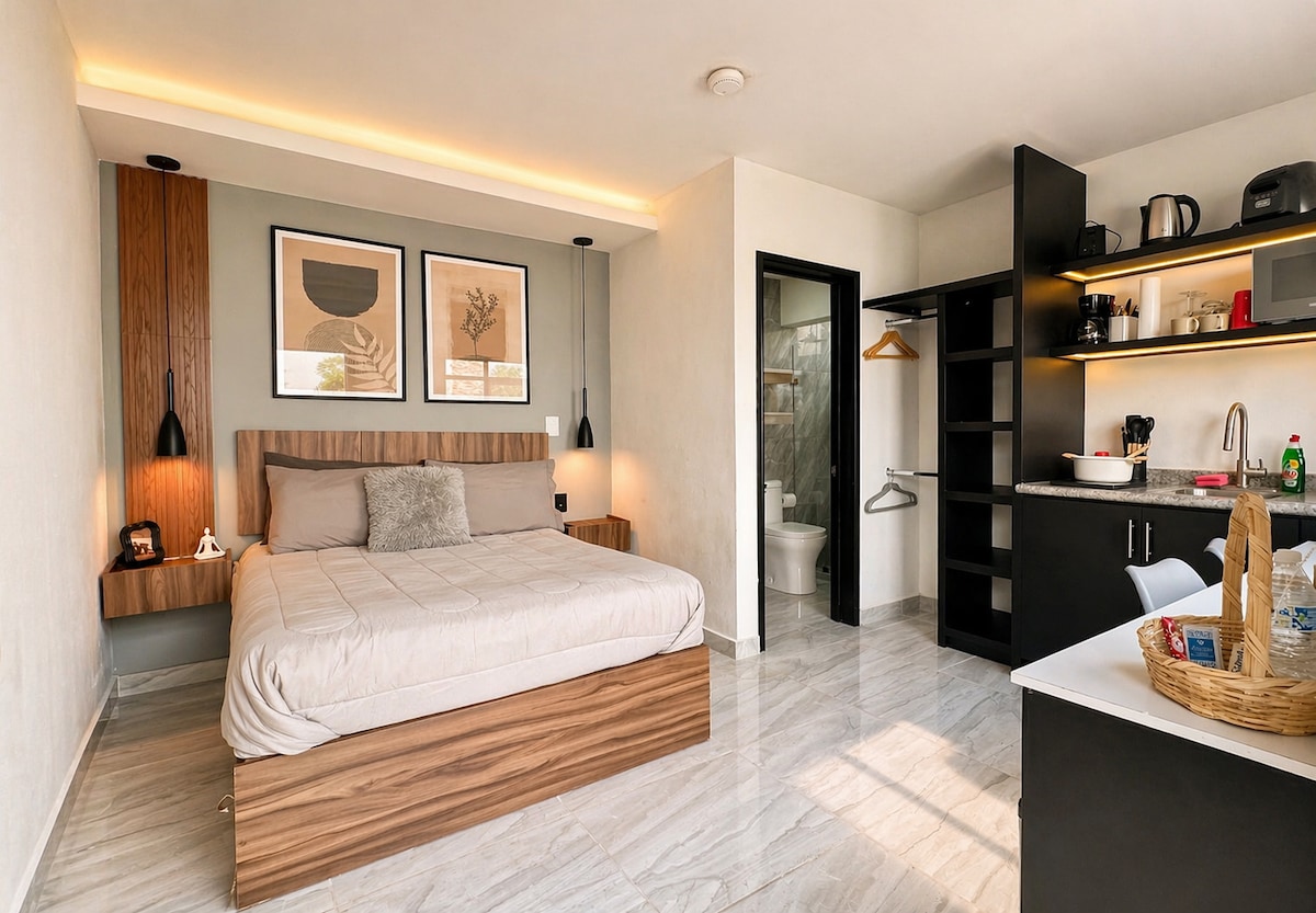 Disfruta de una estancia cómoda y con estilo en este loft moderno, ideal para parejas o viajes de descanso. A solo 4 min del centro, combina ubicación, tranquilidad y diseño tipo hotel boutique. ✨ Cama cómoda, A/C, WiFi rápido, cocineta equipada, estacionamiento privado y agua caliente 24/7. 📍 Ubicación estratégica 💼 Facturamos