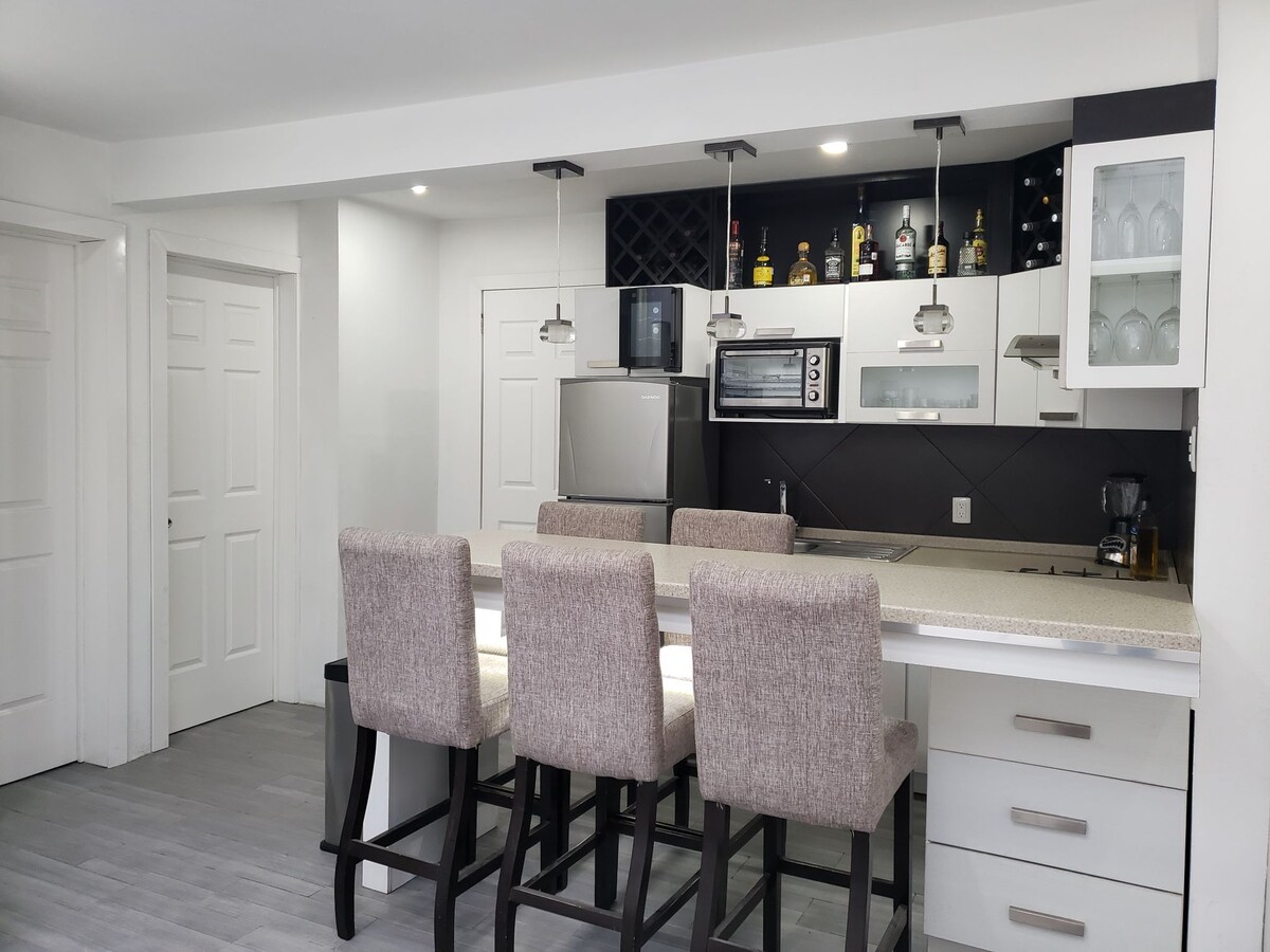 Hospédate con estilo en nuestro condominio central, a solo unas cuadras de la catedral y en un centro comercial que cuenta con Starbucks, un cine y restaurantes. Este espacio ofrece 2 habitaciones (una acondicionada como oficina), 2 baños competos, un sofá grande en la sala de estar que se puede convertir en una cama adicional, una TV de 55 pulgadas, un balcón con sillas y una cocina totalmente equipada con una máquina Nespresso. Wifi de alta velocidad, lavadora/secadora y seguridad 24/7.