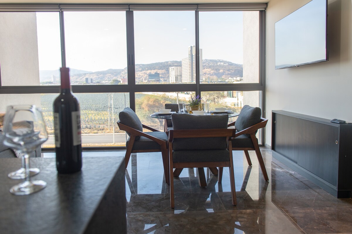 Luxurious and beautiful apartment with art deco design and furniture, relax and enjoy of the view because its in a 9th floor, it has amenities such as a scenic pool, gym, panoramic roof top, social room, bbq grills, security and elevators. The apartment has one room with a queen size bed, one full bathroom, laundry room, full kitchen, refrigerator with ice machine and cold water dispenser. We provide 2 towels for shower and 2 towels for the pool. We also offer tours to city and magic towns.