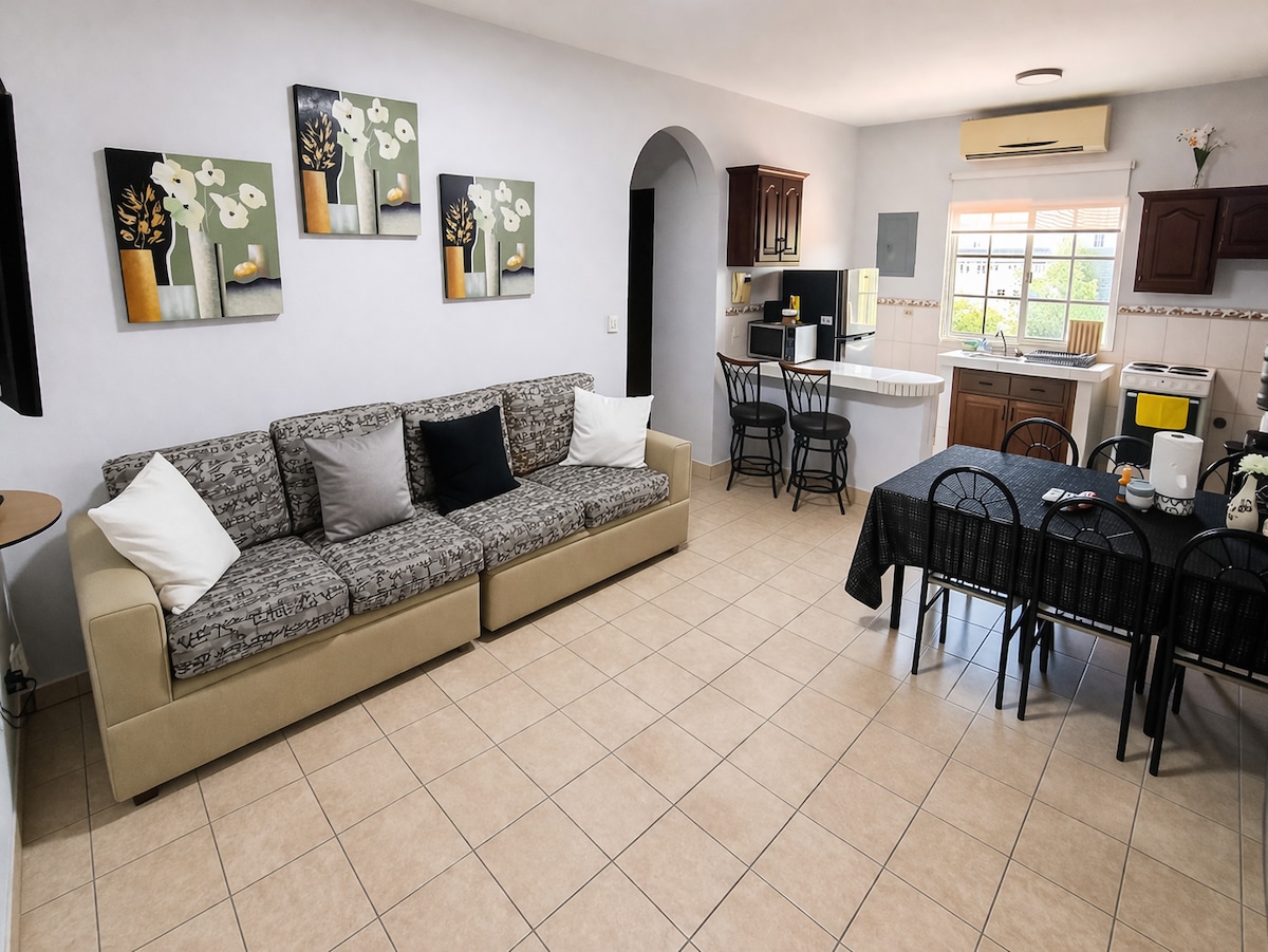 "Moderno, lujoso y acogedor apartamento de dos dormitorios totalmente nuevo. En una zona segura y tranquila. Está amueblado y decorado teniendo en cuenta cada detalle para que te sientas cómodo y relajado en tu estadía. Habitaciones full equipadas, ambas con camas Queen size, sala comedor con terraza privada, dos baños, habitación principal con walk-in closet, cocina equipada y un área de lavado con lavadora/secadora. Planta eléctrica automática."