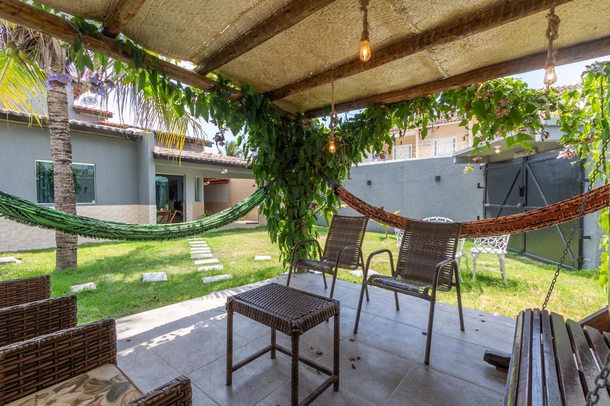 Casa individual, rústica, zona verde, garaje para 5 coches, piscina individual, barrio residencial, tranquilo con cámaras de seguridad en las calles, habitaciones con aire acondicionado, a menos de 2 km de los mejores chiringuitos de Porto Seguro. Tranquilidade en medio de la naturaleza. Piscina adaptada para adultos, ancianos y niños. Lavadora, congelador, refrigerador, estufa de 5 quemadores con horno, microondas, batidora, licuadora, cubiertos y utensilios domésticos usados. NO PROPORCIONAMOS ROPA DE CAMA NI TOALLAS 🛁