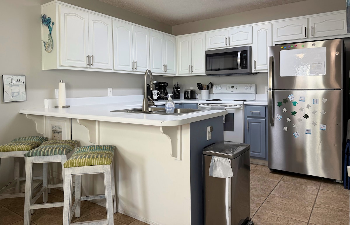 Disfrute de las vistas al golfo y a la bahía desde su balcón privado. Relájese en este condominio junto a la playa con vista al golfo en la distancia, vista a la bahía y fácil acceso a la arena blanca de Navarra. Ideal para parejas o familias pequeñas, el espacio tiene capacidad para 4 personas y puede alojar hasta 5 personas con un sofá cama. Disfrute de un dormitorio con cama king, literas en el pasillo para los niños y una corta caminata hasta la playa, sin pagar precios de primera línea. Limpio, cómodo y diseñado para una escapada sin estrés.