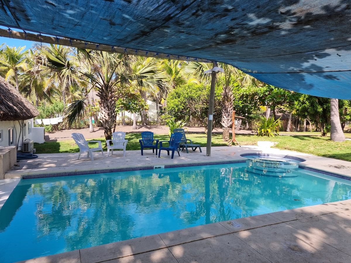 Casa de playa a 100 metros del mar, con piscina grande (11 metros de largo) de agua dulce. **CHECK-IN 10:00am - CHECK-OUT 3:00pm** Dormitorios con A/C, cocina equipada y parqueo privado. La casa esta circulada y se entrega completa con sábanas y almohadas limpias. No tiene ningún espacio compartido con otras personas. Pueden ingresar vehículos bajos sin ninguna dificultad. Ubicada en Km 5 carretera a Monterrico, cruzando el puente de Iztapa a Monterrico.