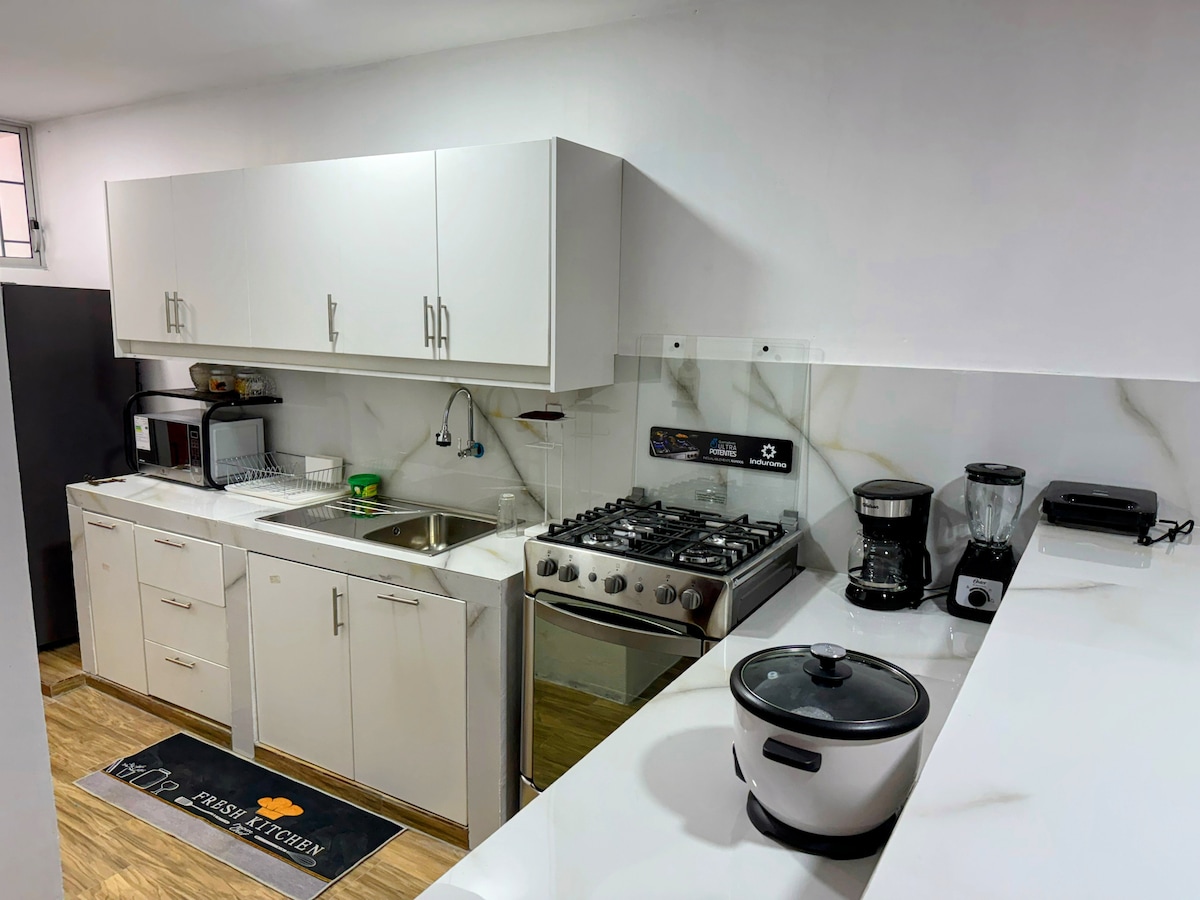 Suite acogedora y bien equipada en zona exclusiva y segura. Disfruta de un espacio cómodo con televisor, aire acondicionado, cocina equipada y baño privado con agua caliente. La habitación cuenta con una cama de plaza y media y un ambiente ideal para tu descanso. Además, tendrás acceso a lavadora, secadora y a una hermosa piscina para relajarte durante tu estadía.