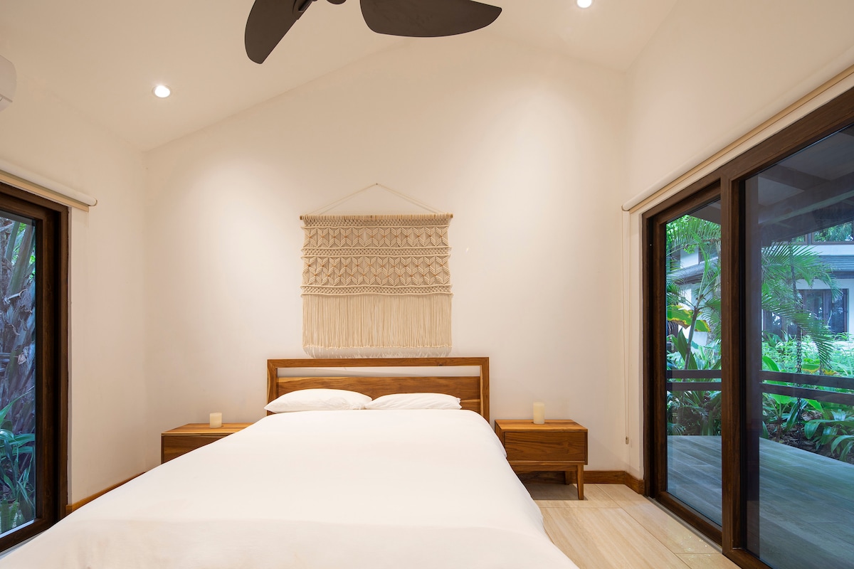 Bienvenido a Indigo Yoga Resort, un lugar único en Mal País, rodeado de naturaleza, con hermosa área de piscina, spa, sala de yoga, a 200 metros de la playa y a 5’ en carro de Santa Teresa y Playa Carmen. La casa Ylang cuenta con dos cuartos, uno con cama queen y otro con dos camas individuales. Cocina, sala, WIFI, A/C, ventilador de techo, galería con vista al jardín y caja de seguridad. Baño privado estilo open air con agua caliente. Aloja hasta 4 personas.
