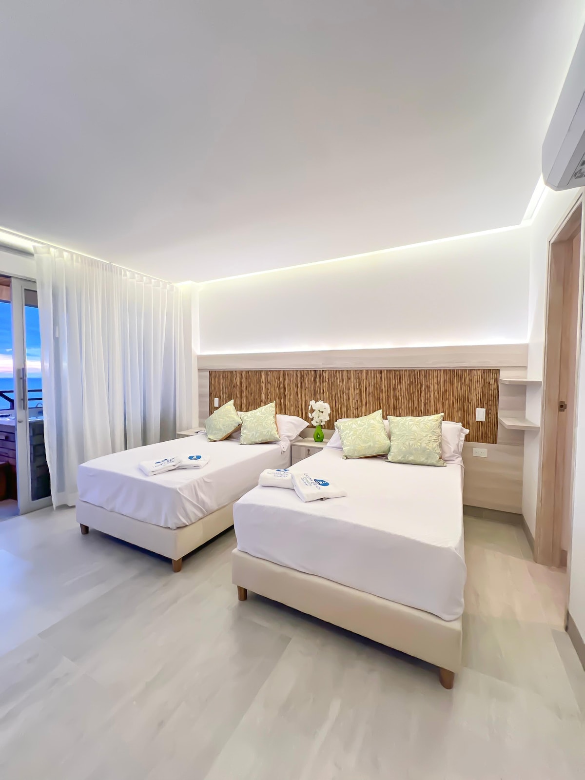 Espectacular suite frente al mar, en un primer piso con playa privada, piscina y portería 24 horas que te ofrece comodidad y tranquilidad; diseñada para parejas, familias, amigos o viajeros que buscan un ambiente acogedor, atardeceres de ensueño, brisa y la serenidad de las playas de la costa caribe colombiana. - Cama Queen + cama auxiliar tipo sommier - Sofacama - Televisor smart - Wifi - Cocina - Baño - Aire acondicionado - Terraza exterior - Parqueadero - Kiosko tipo sombrilla en la playa