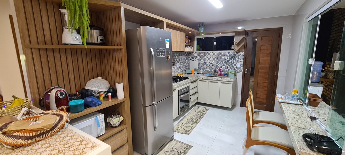 Casa Aconchegante, ubicada dentro del Parque Condomínio Dunas, 4 suites: 2 con baño reversible y balcones, ropa de cama y baño completo, todo con aire acondicionado, duchas eléctricas, gabinetes y hamaca. Piscina completa: estufa con horno, freidora de aire, licuadora, ollas, bebedor de agua, barbacoa, gabinetes de cocina y gran mesa de comedor. Sala: sofá con TV. Área de ocio:con piscina privada, tumbonas, ducha y propietarios de redes.