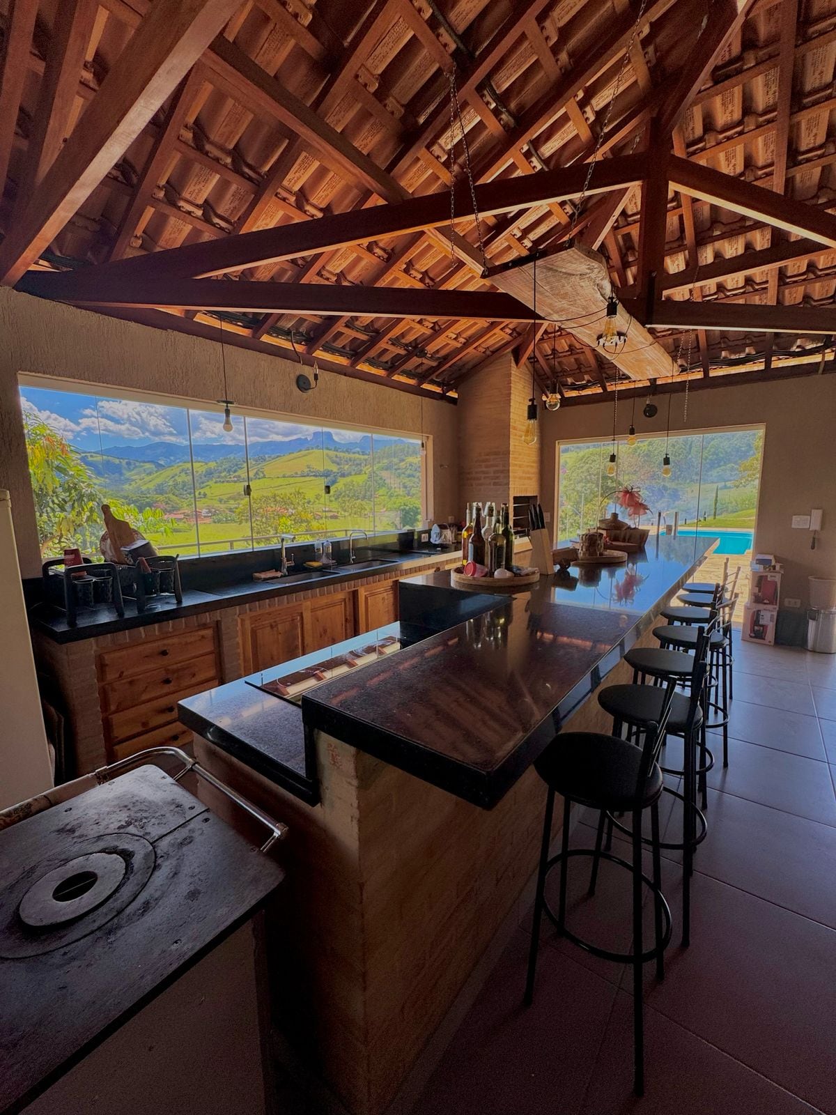 Spacious and bright house, ideal for a unique mountain experience with style and comfort. At 1,380m altitude, it offers exclusive views of Baú Rock, large windows, and a new gourmet area with barbecue, sink, tables, and hammock. From the terrace, enjoy sunsets over Vale Paiol Grande and daily moonrises. Built with exposed brick, reclaimed wood, and demolition materials — a rustic chic charm! 5 min from trails, 20 min from São Bento, and 45 min from Campos do Jordão.