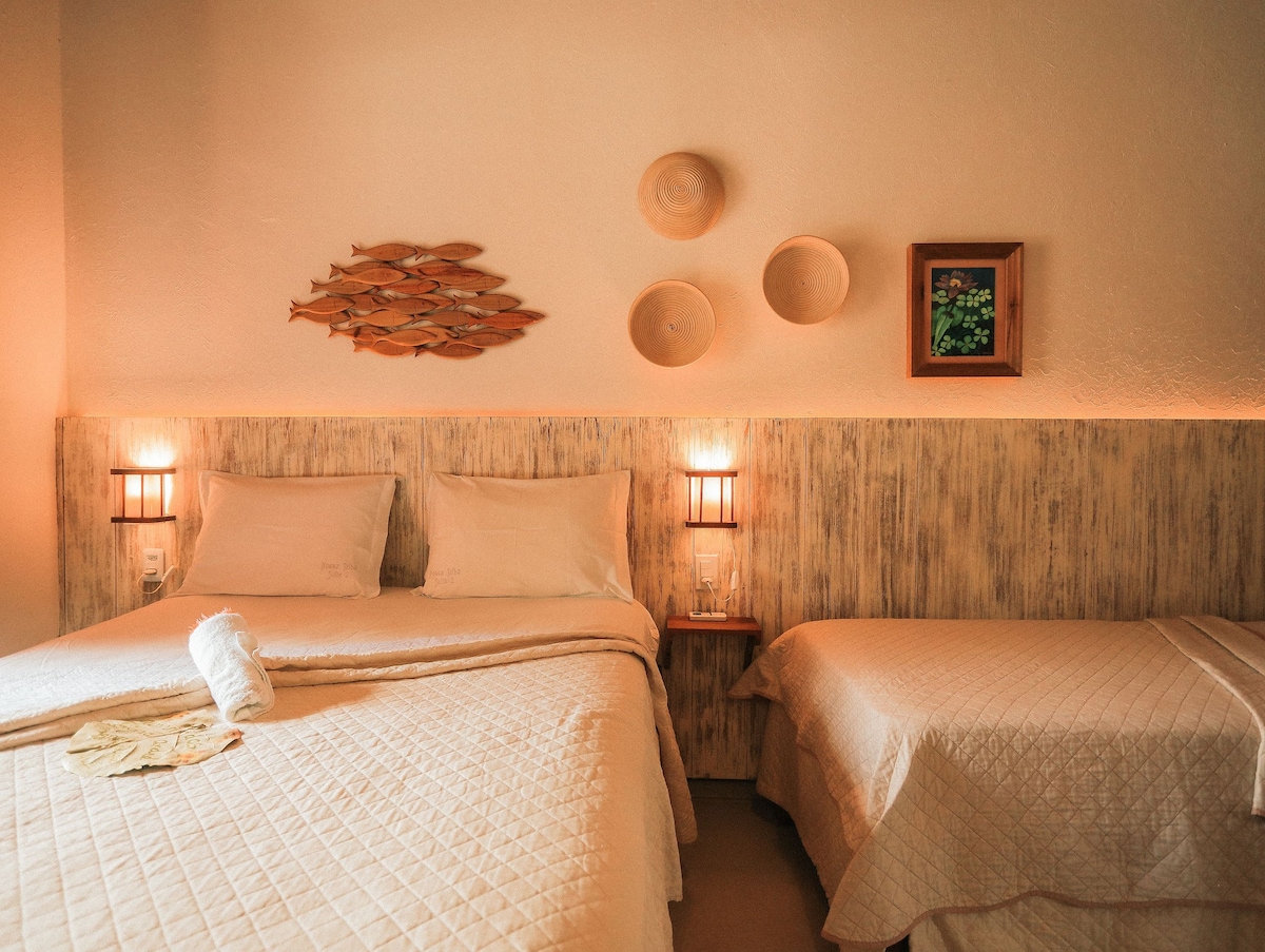 Suíte para 1/2 pessoas, com cama de casal, ar-condicionado, ventilador, banheiro privativo e chuveiro quente. O quarto está localizado no primeiro andar e possui varanda com rede e vista para o jardim da pousada. Ideal para casais ou viajantes que procuram tranquilidade perto da praia.