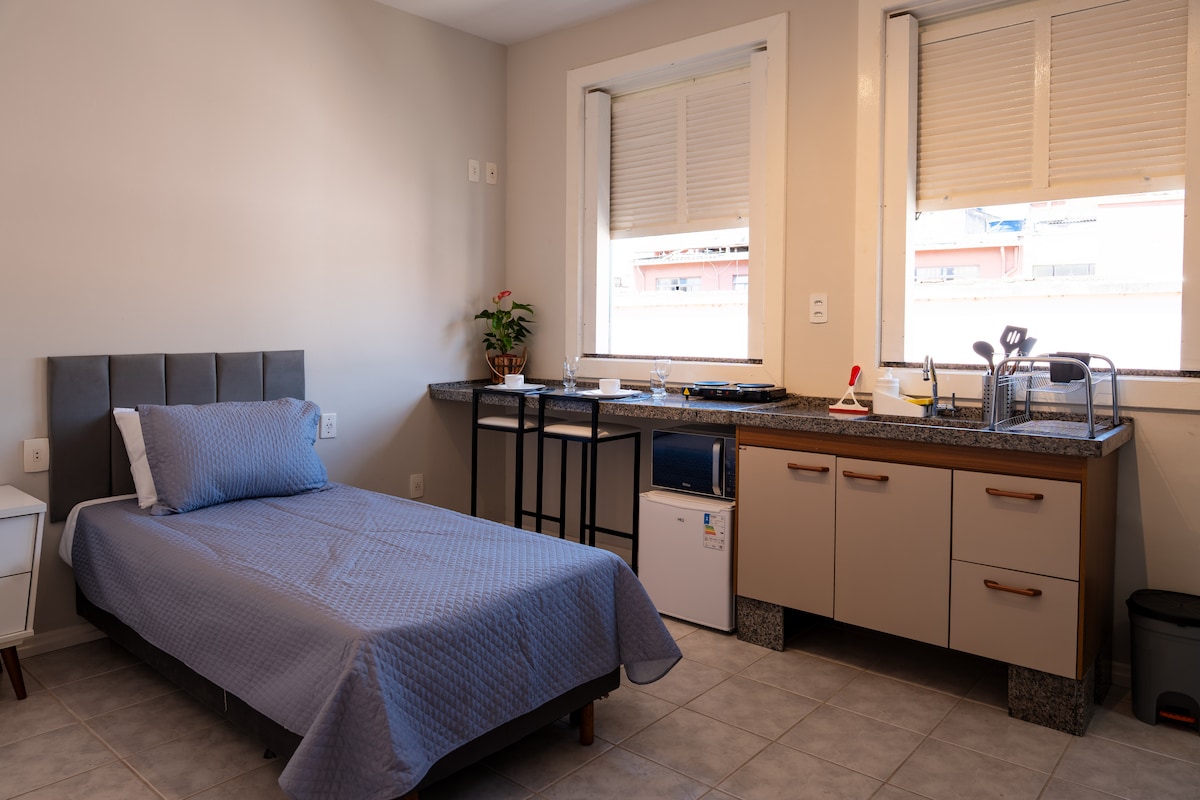 Aconchegante estúdio próximo ao maior cartão postal de São Joao del Rei. Totalmente pensado para o conforto e praticidade de seu morador. Possui cama de casal, smartTV32", cozinha compacta completa, roupas de cama e banho brancas.
