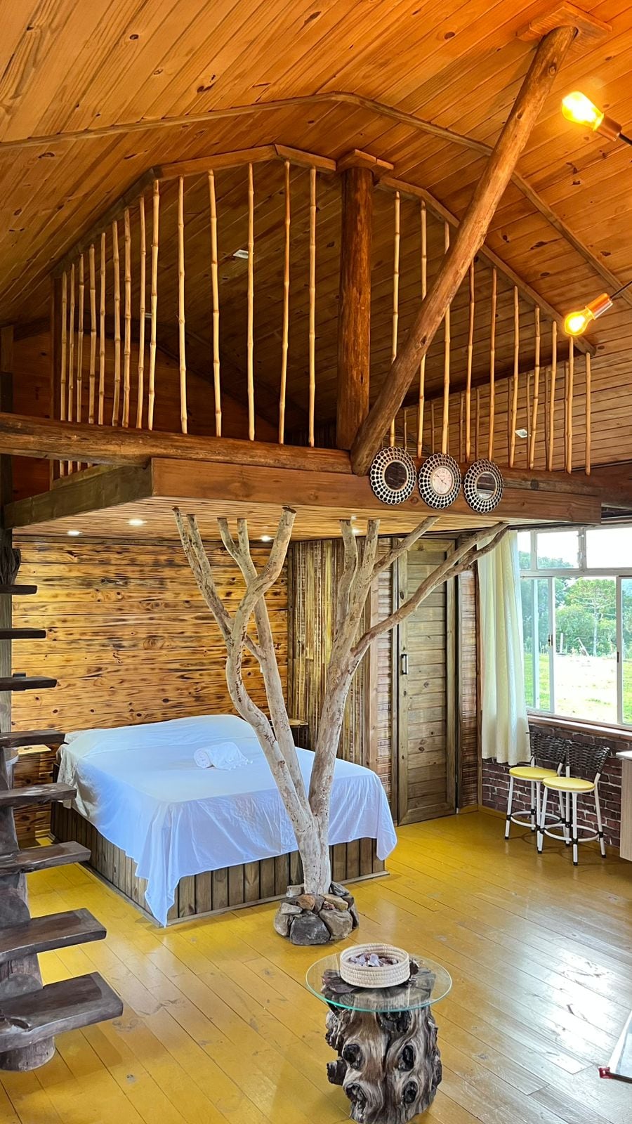 🌿 Cabana no bosque. Fica em área rural, a 15 km da cidade, com trecho de estrada de chão. Ideal para quem busca silêncio, natureza e dias de descanso na Serra Catarinense. Aqui você acorda com o som do rio, prepara sua própria comida, desacelera da rotina diária. • 1 cama de casal • 1 colchão de casal no chão do mezanino • Banheiro com água fria e chuveiro elétrico • Cozinha com utensílios básicos • Roupas de cama e toalhas inclusas Não há mercado próximo (somente na cidade).