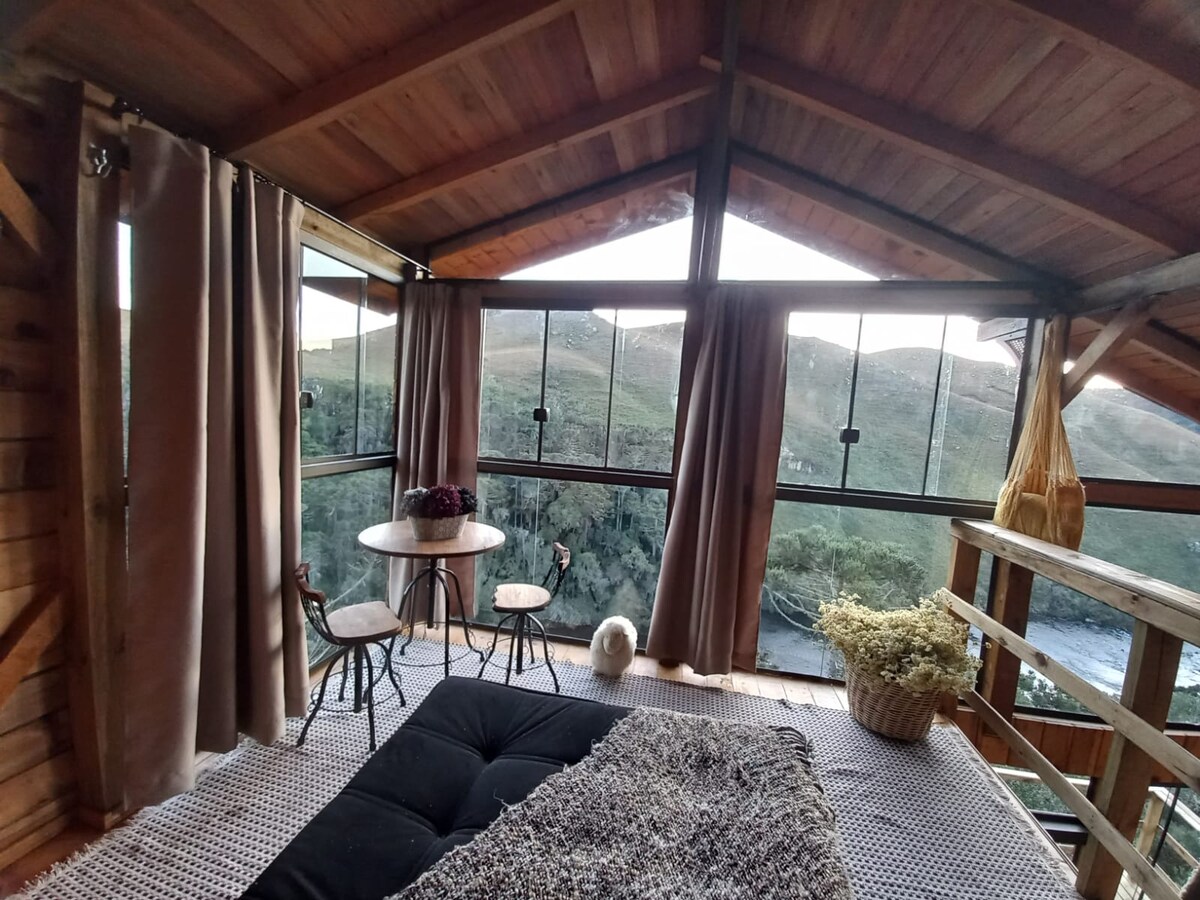 Chalé, área de vidrio, espacio gourmet con barbacoa e increíble vista de la puesta de sol. En medio de los campos sobre las montañas, pero junto a la ciudad ... un excelente espacio para tu descanso después de un día de turismo en los cañones y cascadas de la región , nada mejor que relajarse en la hamaca o disfrutar de una puesta de sol en la fogata y en los días más fríos disfruta de una acogedora chimenea. A tu mascota también le damos la bienvenida aquí. obs: Desayuno exelente opcional, no incluido en la tarifa diaria.