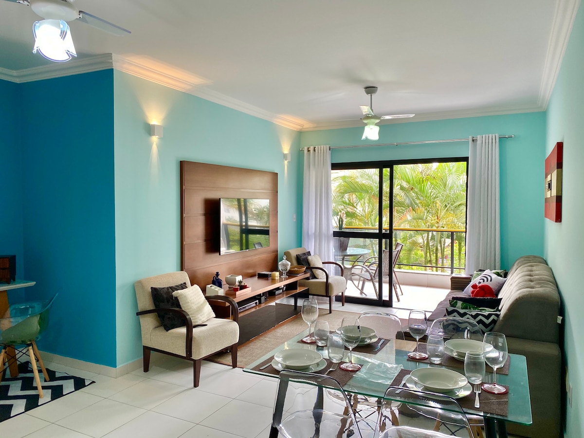 El apartamento está en el módulo 3, tiene un hermoso balcón con vista parcial al mar (con pantalla protectora), cerca del centro comercial y hermosos paisajes. La playa es hermosa, tranquila, limpia, muy segura y el apartamento está a una cuadra de la playa. El espacio es excelente para parejas y familias. Cuenta con 2 piscinas, 3 zonas de barbacoa, sauna, sala de juegos, un espacio súper agradable para disfrutar de sus vacaciones. Hay wifi excelente en el apartamento, para que puedas trabajar en casa con toda tranquilidad.