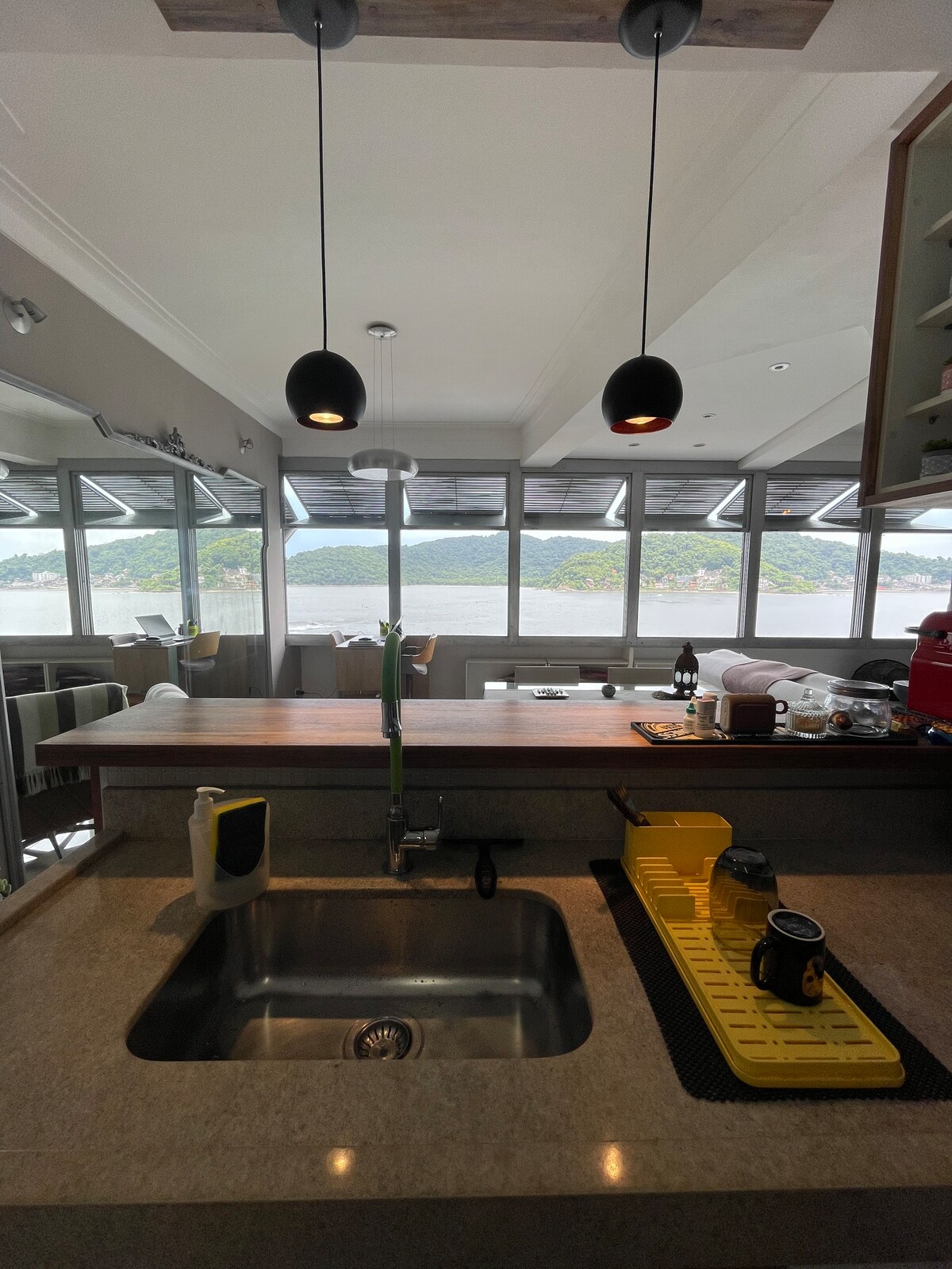 Venga a disfrutar de la experiencia de alojarse en el mar, con una vista increíble, en un apartamento acogedor, cómodo, limpio, seguro y completo, con todo lo que necesita para relajarse y disfrutar de la vista desde la ventana. Situado en la cima de la Isla Porchat, en SV. Apartamento con aire acondicionado, cama box doble, sofá cama, Smart TV con acceso a Netflix, internet de alta velocidad, cocina completa con todos los utensilios necesarios para preparar comidas y disfrutar de la paz y la tranquilidad.