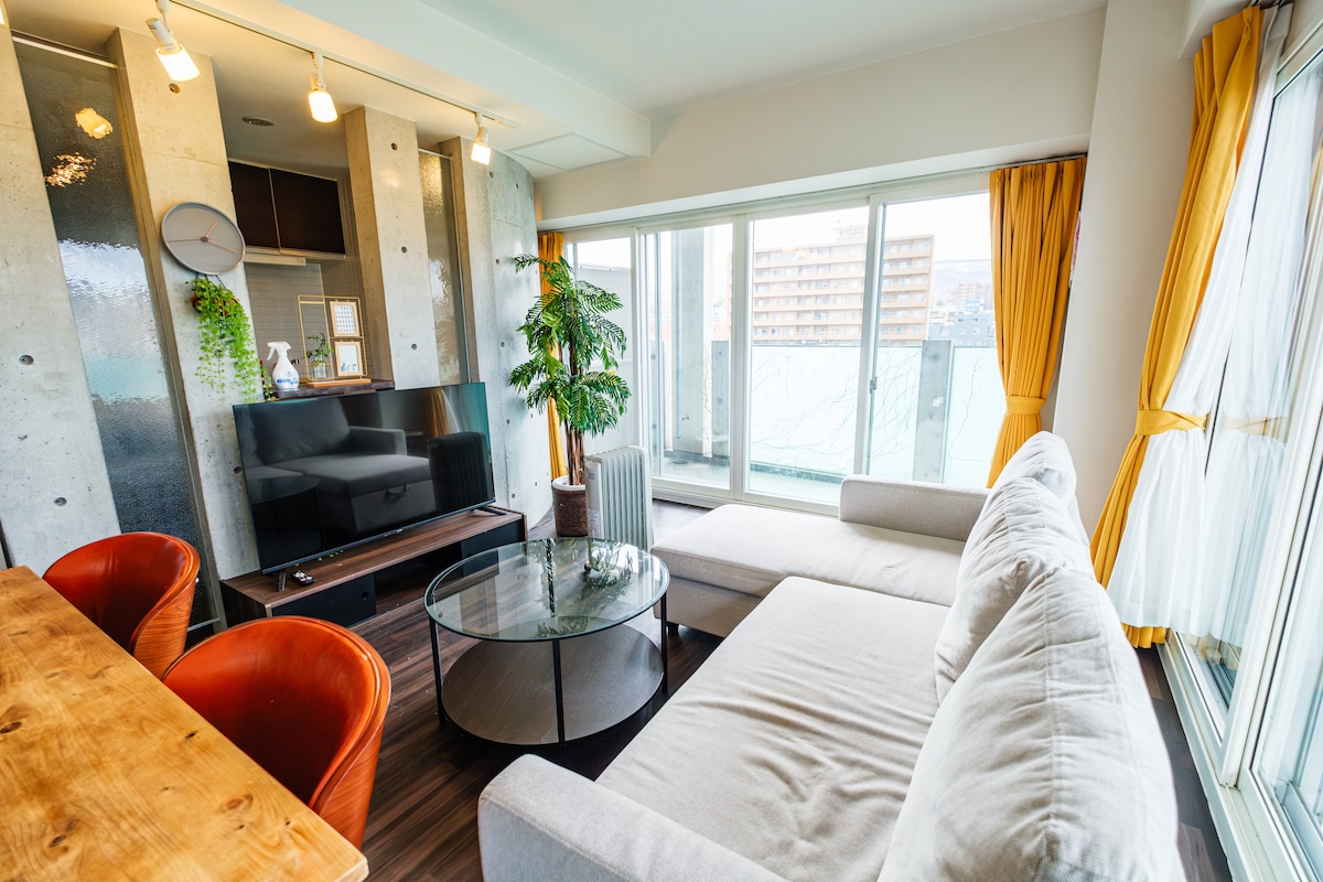¡Con unas vistas panorámicas de Sapporo, este apartamento de lujo en el último piso de un edificio de 65 metros cuadrados tiene capacidad para un máximo de 8 personas!