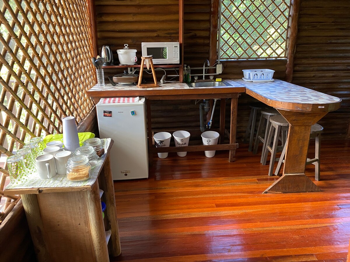 A private Ecological House surrounded by forest; it balances sustainability, comfort, and a rustic feel. The Eco House is fully furnished with microwave, coffee maker and refrigerator, hot water, hardwood floors, hammocks, clothes line, etc. This beautiful home is located on a 2 hectares family property, 200 meters from the host’s family home. Here you may enjoy the beauty of nature and abundant wildlife around you, the nice environment, and the welcoming hospitality of your hosts.