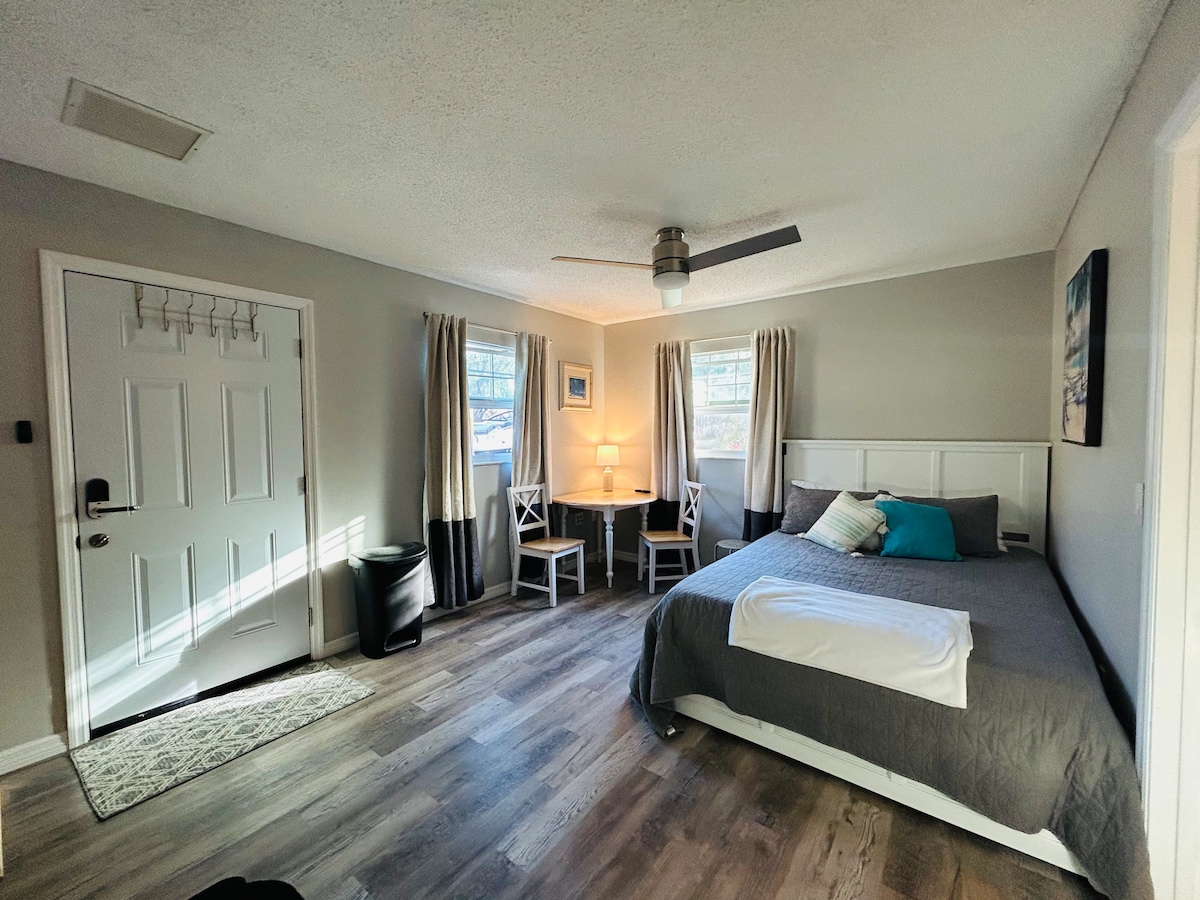 Bienvenido a tu moderna Suite para Huéspedes en Sarasota – Solo Adultos, Privada y Tranquila Remodelada el 26 de enero de 2026, esta suite privada ofrece una entrada independiente y estacionamiento para dos . Disfruta de una cómoda cama queen, un baño completo y una cocineta equipada con microondas, mini‑refrigerador, cafetera y más. Relájate en tu patio privado con ducha solar. Proveemos esenciales de playa: sombrilla, sillas, nevera y toallas —perfectas para tus días de playa en Sarasota.