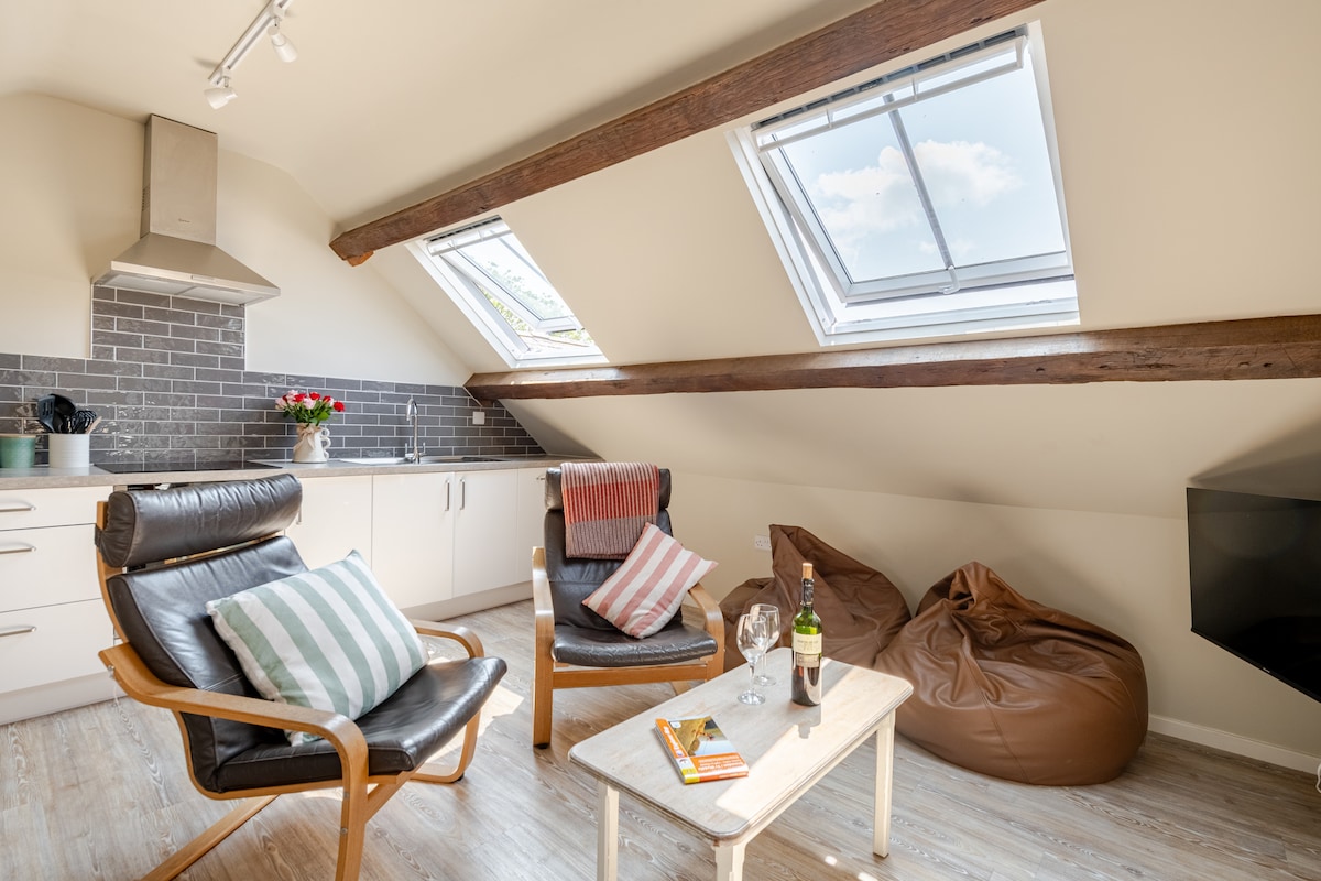 A good quality contemporary apartment situated on the first floor, accessed by stone steps adjoining the owners farm house on a working farm, in the village of Tudweiliog. It has a pleasant private balcony area, south west facing with views accross the rolling countryside. A charming mix of original beams, and clean modern interior makes this property spacious for couples. The tip of the Lleyn Peninsula is home to many sandy beaches and coves. Shop and pub one mile in village.