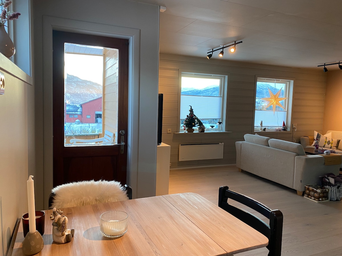 Discover the ideal year-round retreat! Our apartment offers exciting winter and mountain experiences with ski lifts and cross-country trails right outside your door. Wonderful mountain hikes on foot, incl. Hovlandsnuten. Explore the charming town at the end of the fjord, with a selection of shops and fun activities to enjoy. Here you'll also find Saudahallen and Andedammen family park. Experience the best of both worlds in our cozy apartment, where adventure and town charm come together.