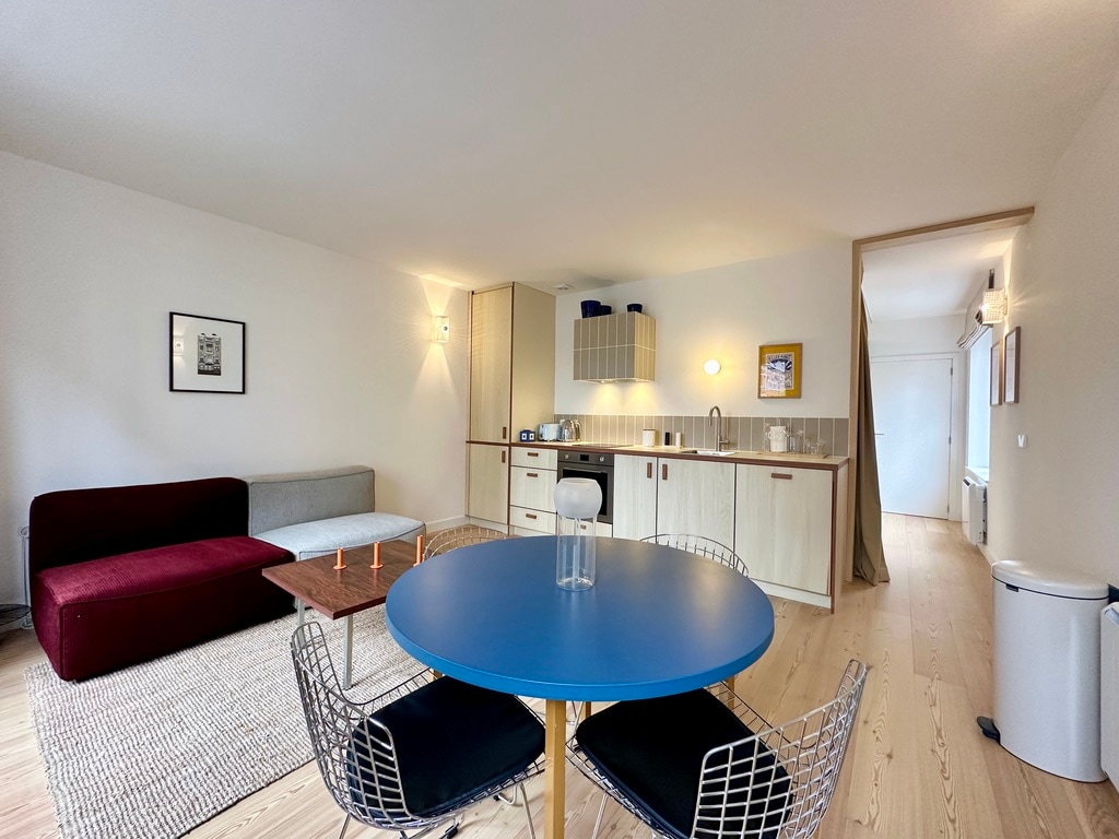 Situé au deuxième étage de Maison Liberté, élégante demeure bruxelloise à deux pas de la Place de la Liberté, Léon est un appartement entièrement rénové à l’atmosphère élégante et apaisante. Sa décoration aux tons beiges et naturels crée une ambiance raffinée et chaleureuse. Entre design soigné, confort moderne et emplacement idéal en plein centre de Bruxelles, Léon offre un cadre parfait pour découvrir la ville tout en profitant d’un logement calme et élégant.