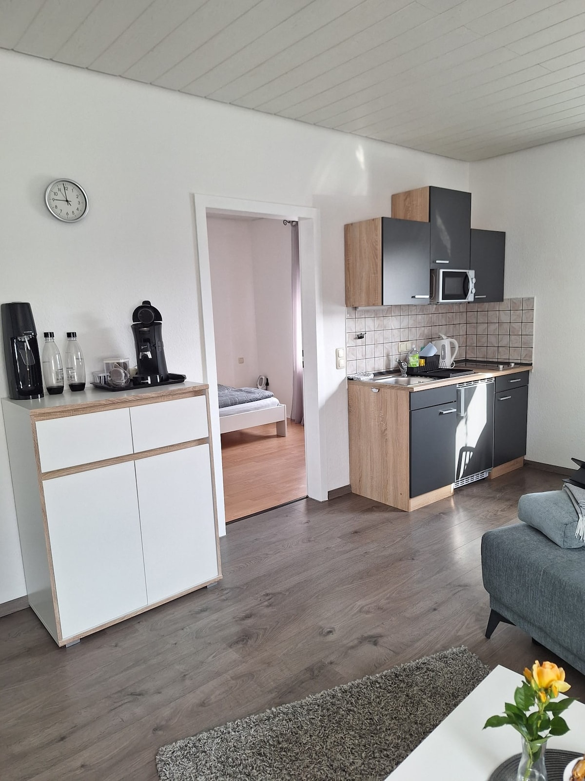Estimados huéspedes potenciales: Tanto si estás de paso, como si vienes para una escapada corta o más larga, nuestro apartamento es de rápido acceso y un buen lugar para relajarse por la noche, por ejemplo, en el balcón con vistas. El sofá cama en la sala de estar es muy cómodo, por lo que puedes dormir bien en dos habitaciones. En el pueblo hay una hermosa piscina al aire libre y buena gastronomía, a su alrededor hay mucho bosque. Nuestra cafetería tiene desayuno entre semana a partir de las 6 o 7 en punto los fines de semana.