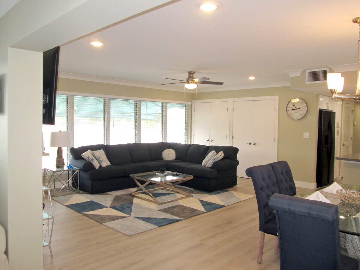 ¡A 3 casas (200 yardas, 0,1 millas) del acceso a la playa! ¡Somos uno de los alquileres de casas más cercanos a la playa! Perfecta para 2 parejas: planta dividida con 2 camas tamaño queen (somieres eléctricos) con 2 baños completos + amplio sofá de 7 plazas. Cada habitación tiene un televisor de 55-65 pulgadas con Comcast, wifi rápido, HBOMax, Netflix, Hulu, AppleTV. ¡Nuestra casa está cerca de todo! - Playa: 3 casas (en la carretera de acceso a la playa). - Centro de la ciudad: a 0,3 millas de restaurantes/bares. - Publix/CVS: a 9 casas de distancia.