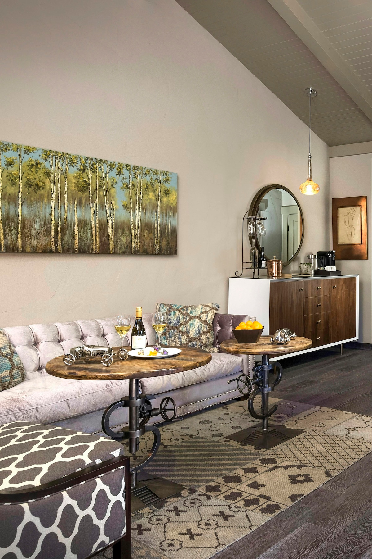 One queen bed and one twin bed, both with a restful pillow-top & soft linens. A relaxing sitting area featuring a fireplace, a flat-screen television & a music player. Convenient comforts include an in-room Keurig coffee maker, mini-fridge, microwave, ironing set & hairdryer. Due to the mild climate of the Central Coast, the property, like most in the area, does not offer air conditioning.