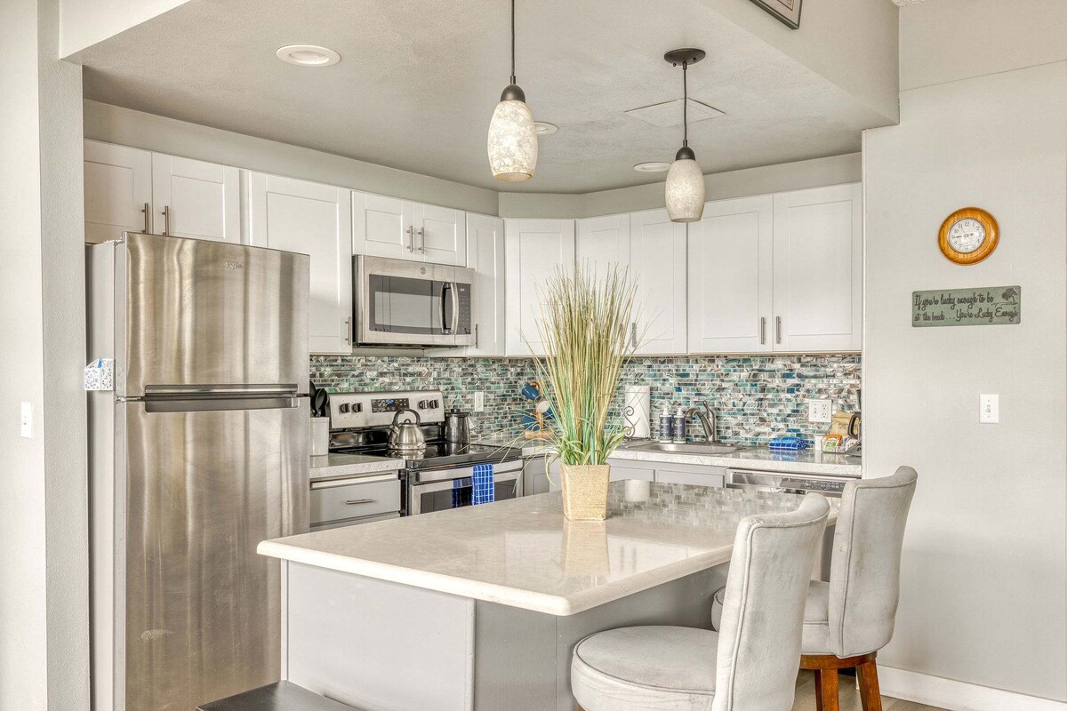 Relájate en este luminoso y espacioso apartamento de 2 dormitorios en el segundo piso. La sala de estar boho-chic cuenta con vistas panorámicas al mar, chimenea eléctrica y techos abovedados. Cocina completa para preparar comidas y una gran mesa de comedor para las noches de juego. El dormitorio 1 tiene una cama tamaño king con colchón Sleep Number para una firmeza perfecta; el dormitorio 2 cuenta con literas tamaño queen y vistas al mar. Camina por la playa, nada en la piscina, camina hasta tiendas y restaurantes, o simplemente disfruta de nuestras gloriosas puestas de sol.