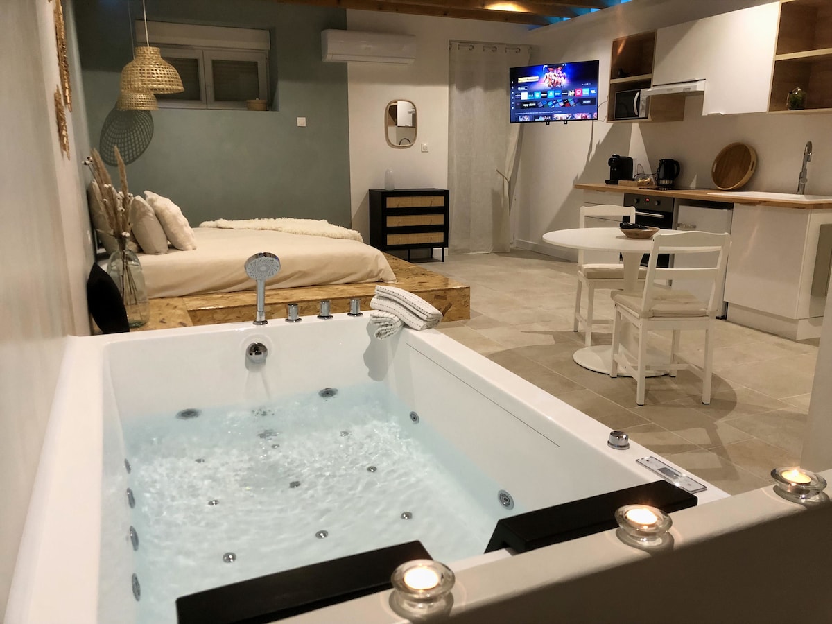 ¿Le apetece una escapada romántica, un descanso de bienestar o una estancia tranquila en el campo? Descubre nuestro estudio totalmente renovado con buen gusto, ubicado en el corazón de una antigua granja, que ofrece un entorno único e íntimo para momentos inolvidables. Relájate en el jacuzzi balneario para dos personas, o disfruta del jardín compartido para tomar un poco de aire fresco. También tiene a su disposición un salón de jardín privado para disfrutar plenamente de la tranquilidad del lugar.