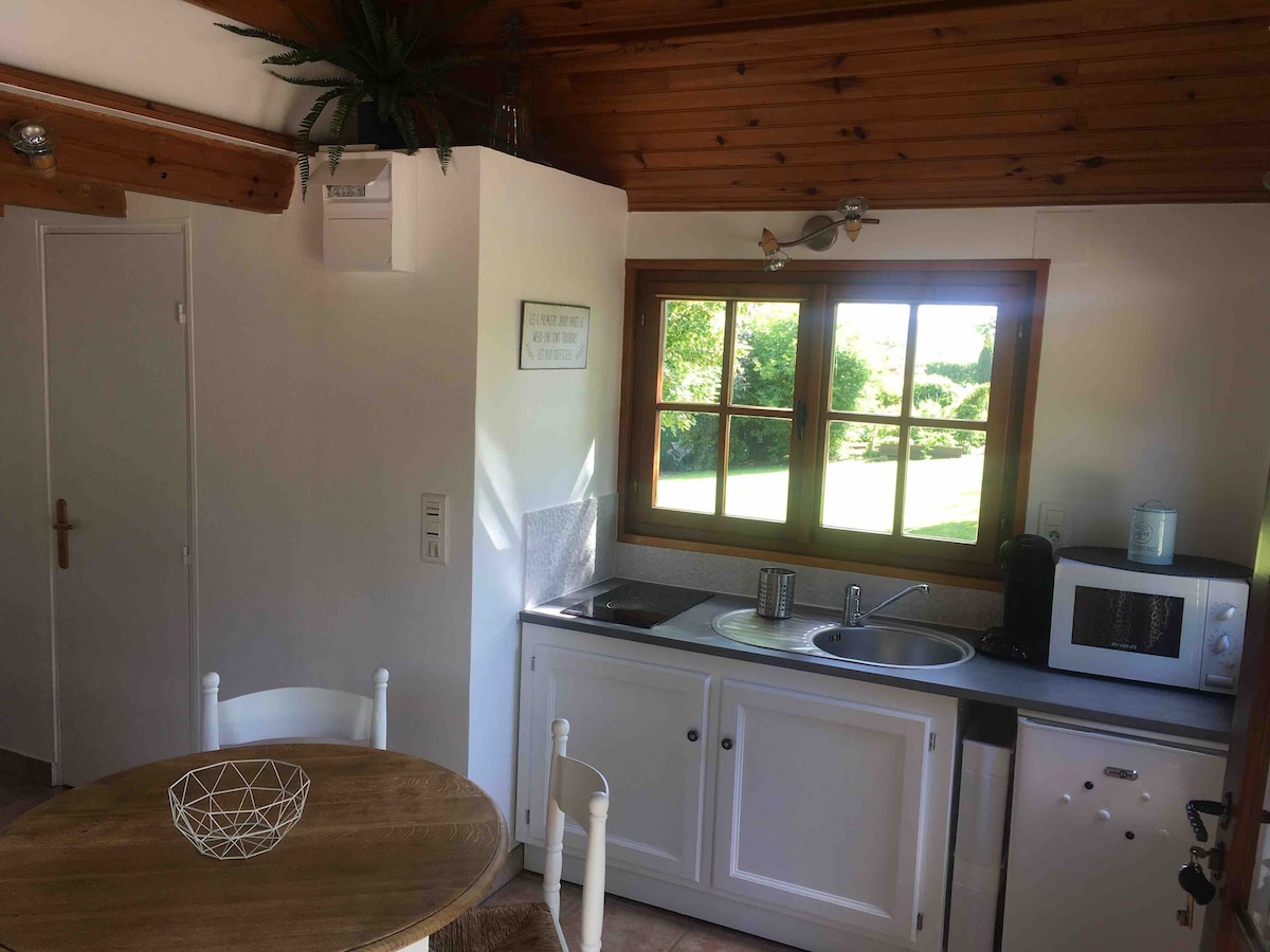 Le damos la bienvenida a nuestro chalet independiente recién reformado situado en una zona tranquila en nuestro jardín cercado y arbolado (acceso en coche). Chalet de unos 19 m2 que cuenta con una cama doble y 2 camas individuales (atención: ¡las camas individuales están en el altillo!), una zona de cocina totalmente equipada (microondas, placa vitrocerámica, cafetera senseo, nevera, etc.), una mesa con 4 sillas, etc. Y un pequeño cuarto de baño con inodoro y ducha. No se proporcionan toallas.