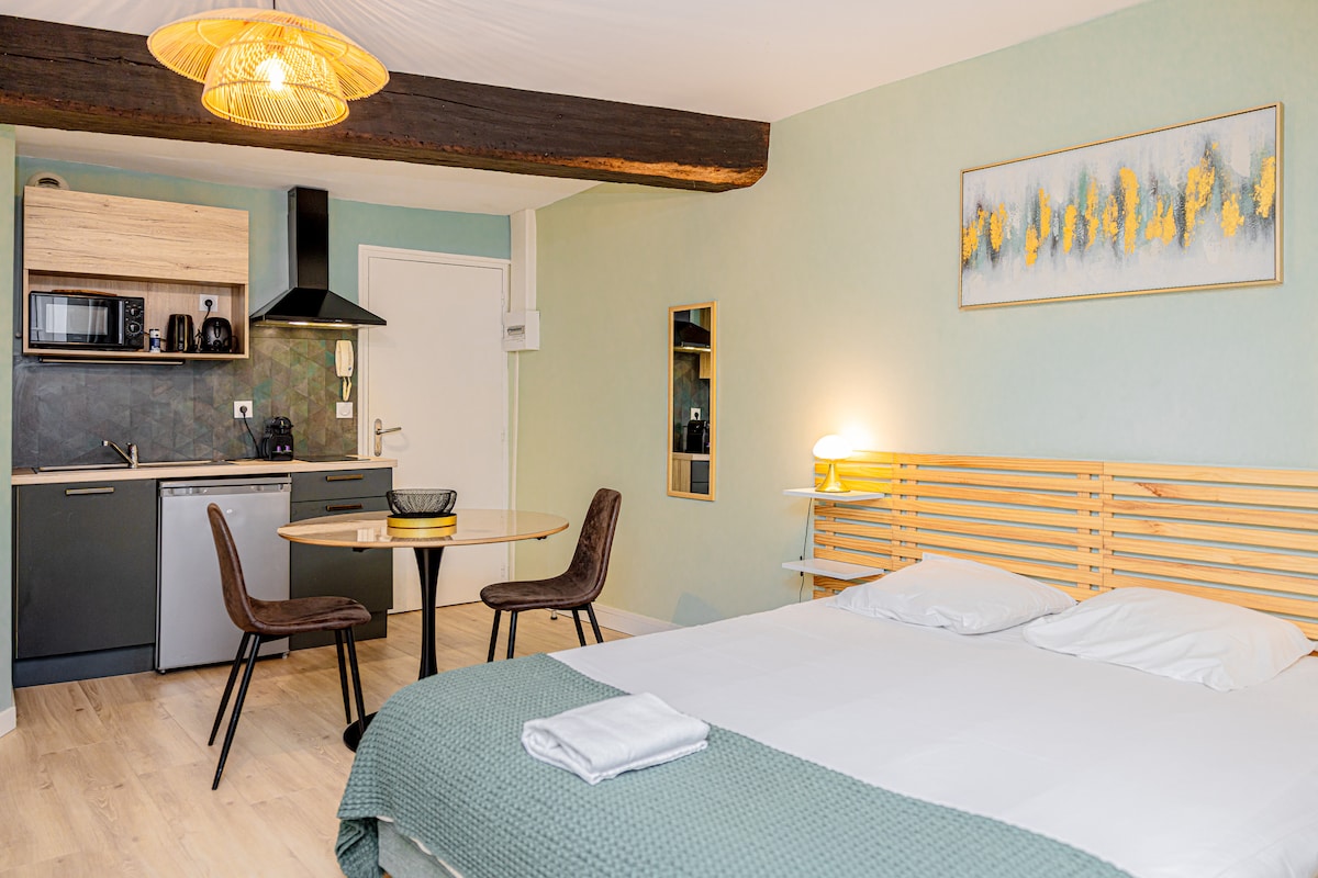 Idealmente situado en una calle peatonal muy tranquila en el centro histórico de Orleans. Ubicado en el segundo piso sin ascensor, con vistas a las torres de la Catedral y las casas de entramado de madera. El encanto de lo antiguo a veces tiene sus pequeños inconvenientes, el aislamiento acústico no es perfecto y es posible escuchar los ruidos de la vida cotidiana de los vecinos.