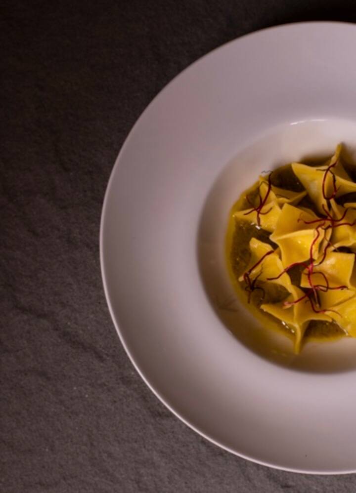 Ofrezco tortelli de ricotta fritos, rebozados con queso y pimienta, barquitos de pasta hojaldrada con mousse de finocchiona, tortelli de patatas artesanales con aceite de romero y panceta crujiente, jabalí con manzanas, sal.