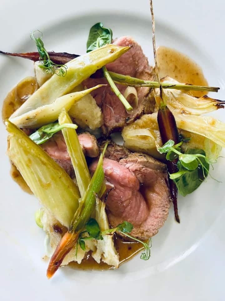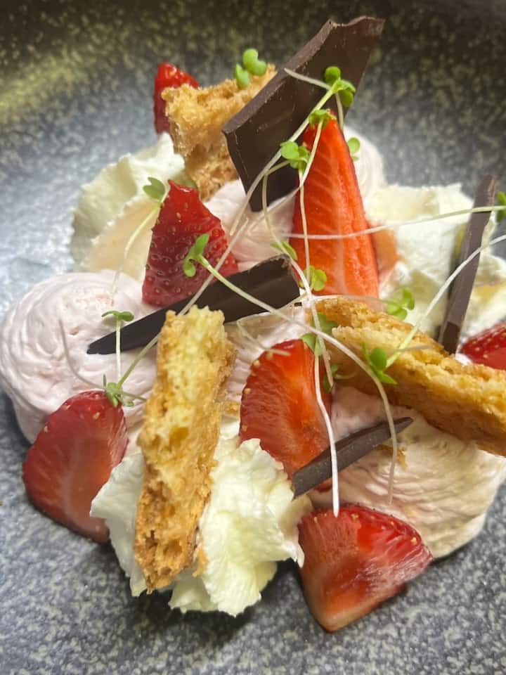 Descubra nuestro menú Signature con flores de calabacín rellenas como entrante, una tarta de verduras crujientes como plato ligero, seguido de un desmenuzado de carrilleras de ternera o un filete de corvina asado, y termine con una delicada crema de limón merengada.