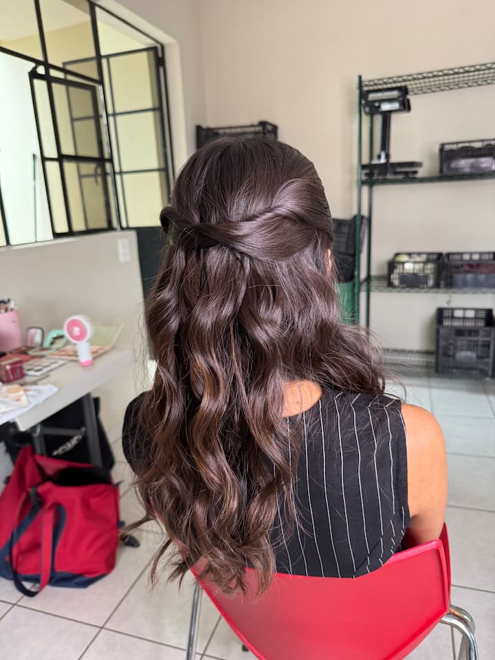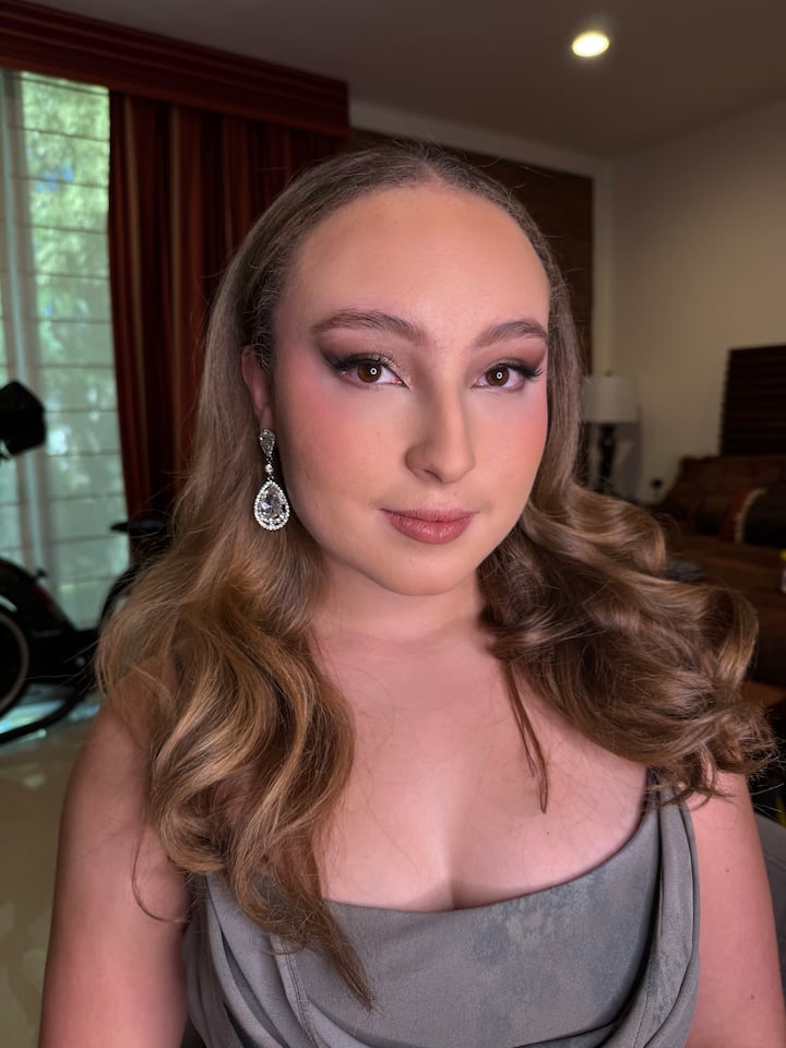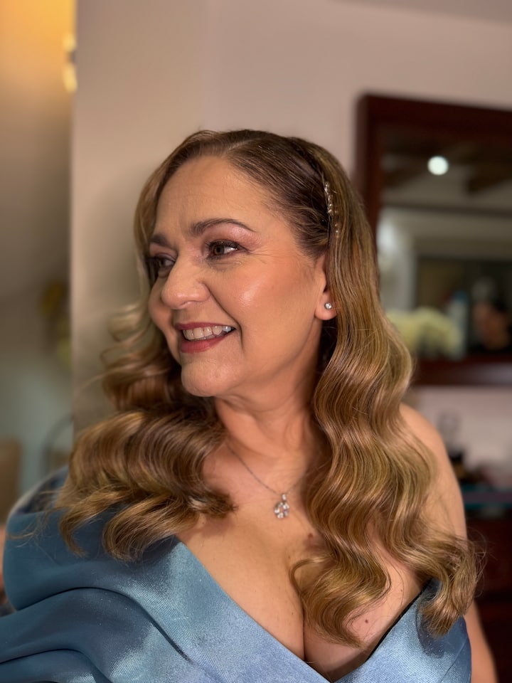 Secado, cabello lacio, ondas, ondas de Hollywood, medio recogido o un recogido suave. Incluye maquillaje suave y glamuroso.