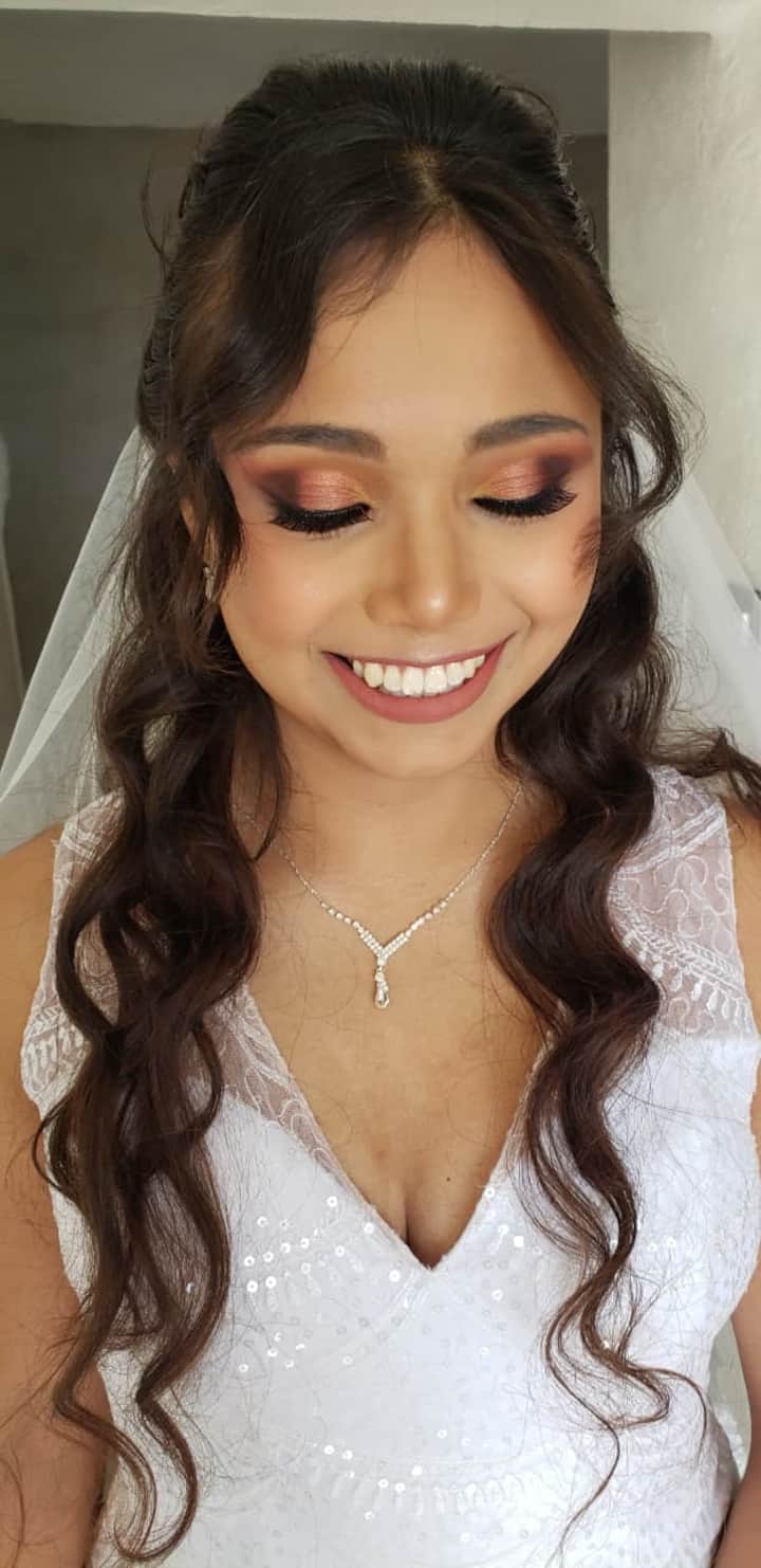Este maquillaje está diseñado para las novias. Incluye asesoría de imagen, 2 pruebas de pestañas 3D, preparación de la piel, iluminadores y maquillaje corporal. Se busca lograr una apariencia natural y sofisticada.