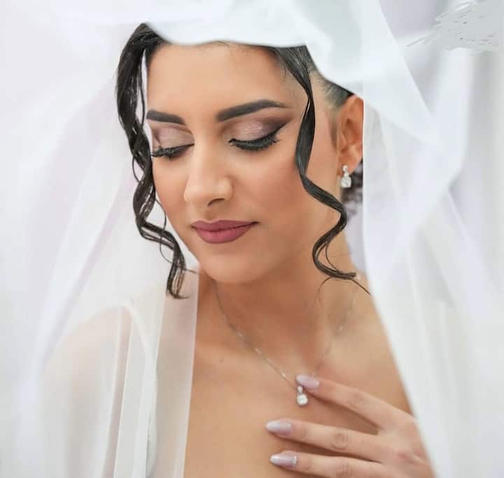 Es un maquillaje elegante y luminoso diseñado para realzar los rasgos con un efecto natural y armonioso. La base es uniforme y radiante, la mirada se define con tonos suaves y reflejos específicos, mientras que los labios se completan con colores delicados y románticos. El trabajo está diseñado para mantener una apariencia fresca y equilibrada en las fotografías y acompañar a la novia durante toda la boda.