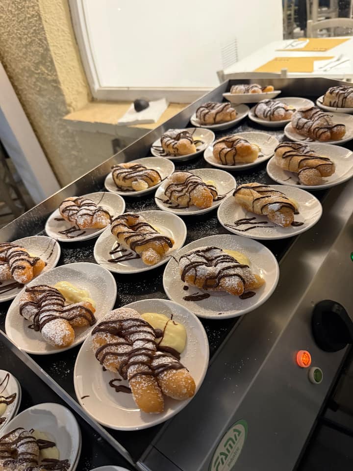 desayuno variado con varios pasteles y pasteles, huevos cocinados a pedido, tocino, panqueques, pandorini extra rellenos o solicitudes especiales que se deben hacer con anticipación