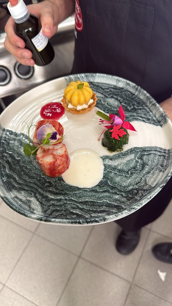 Esta selección incluye: un aperitivo de pescado cocido y crudo, un primer plato a base de pescado y un filete de pescado con guarniciones y una esfera digestiva